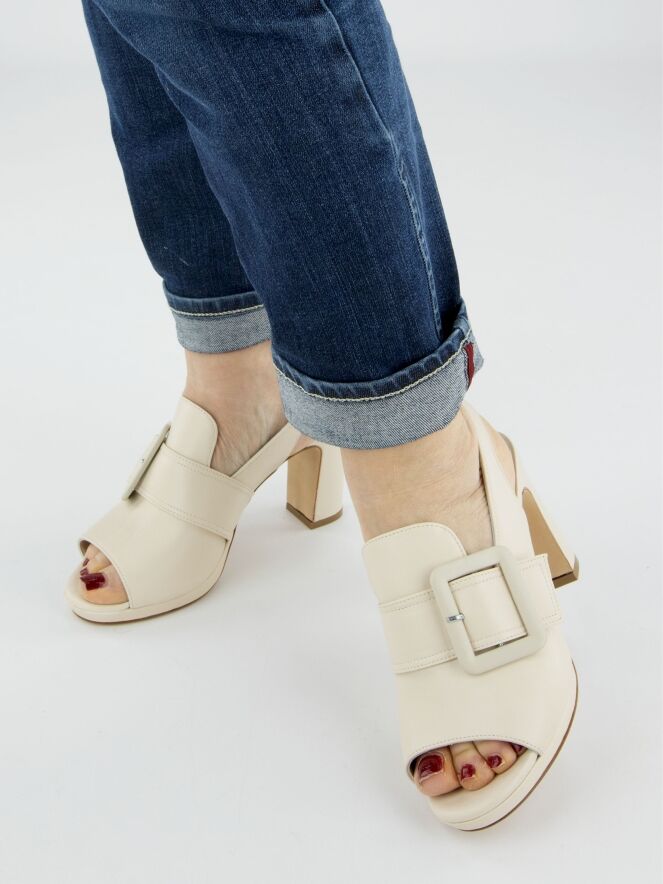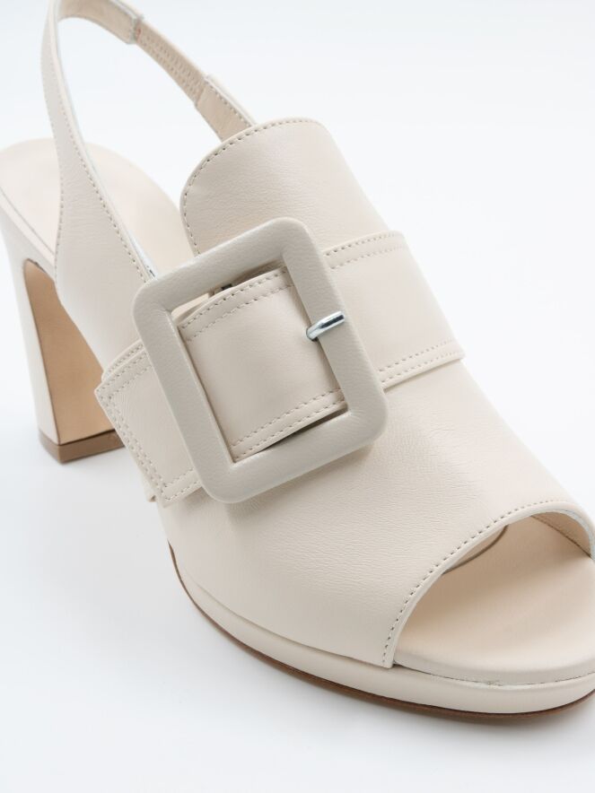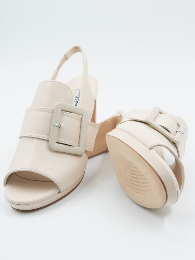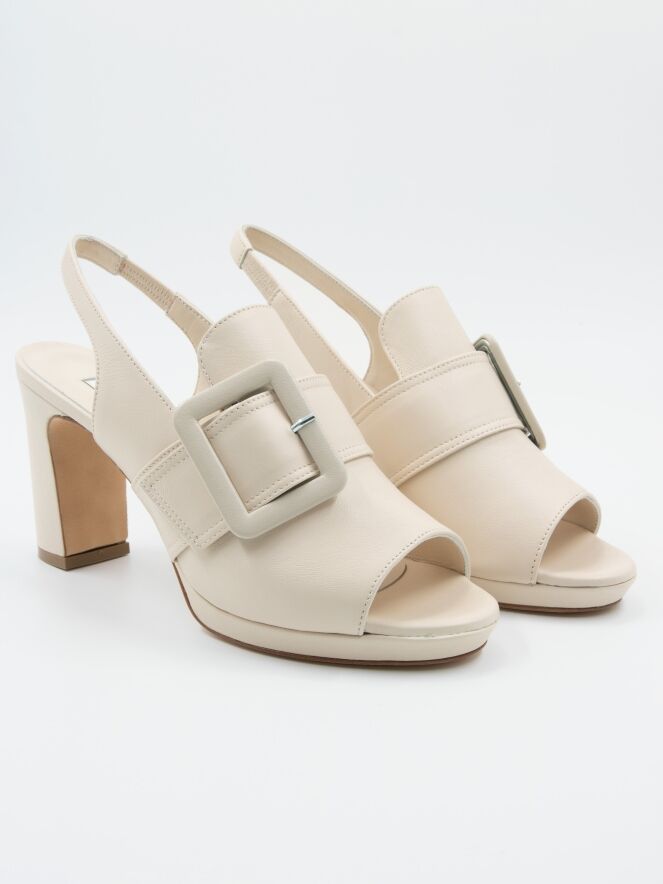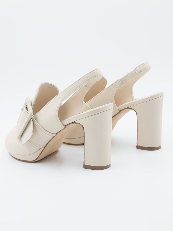 An open-toe pump from Cervone in a creamy white color. There is a large rectangular buckle over the forefoot in the same color as the shoe. The pump has an open toe, and the heel strap has an elastic part.