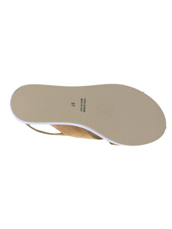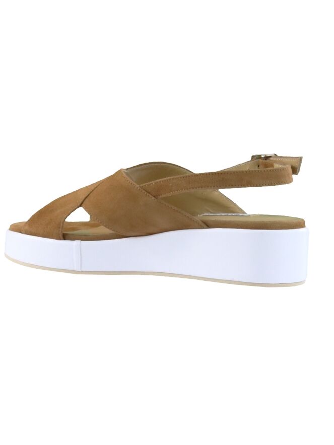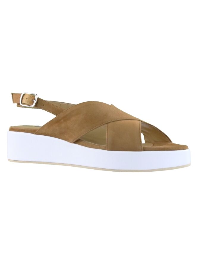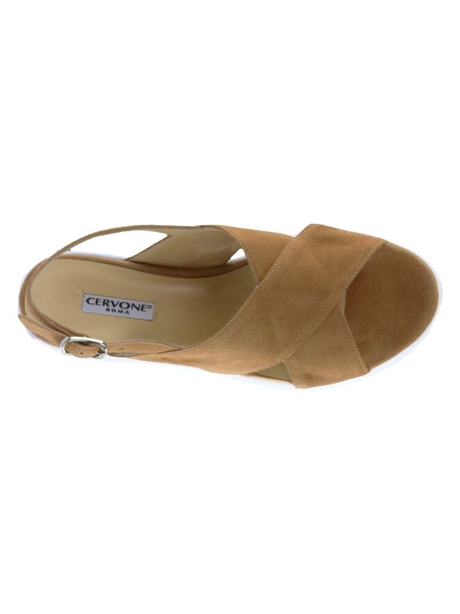 A luxury sandal from Cervone in the color camel. The suede is crossed over the forefoot. The heel strap is adjustable. The platform sole is in the color white. The inside of the sandal is lined with leather.