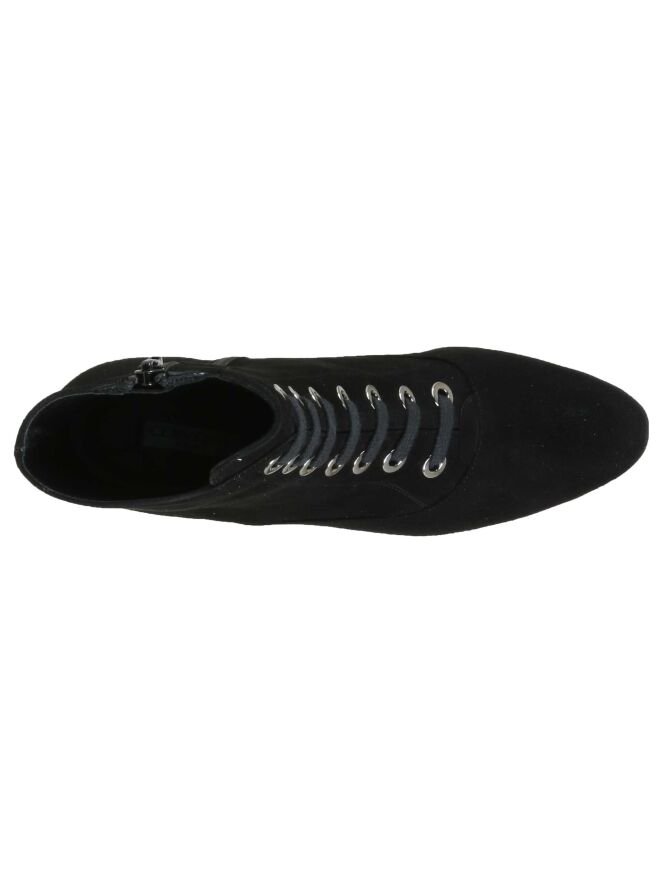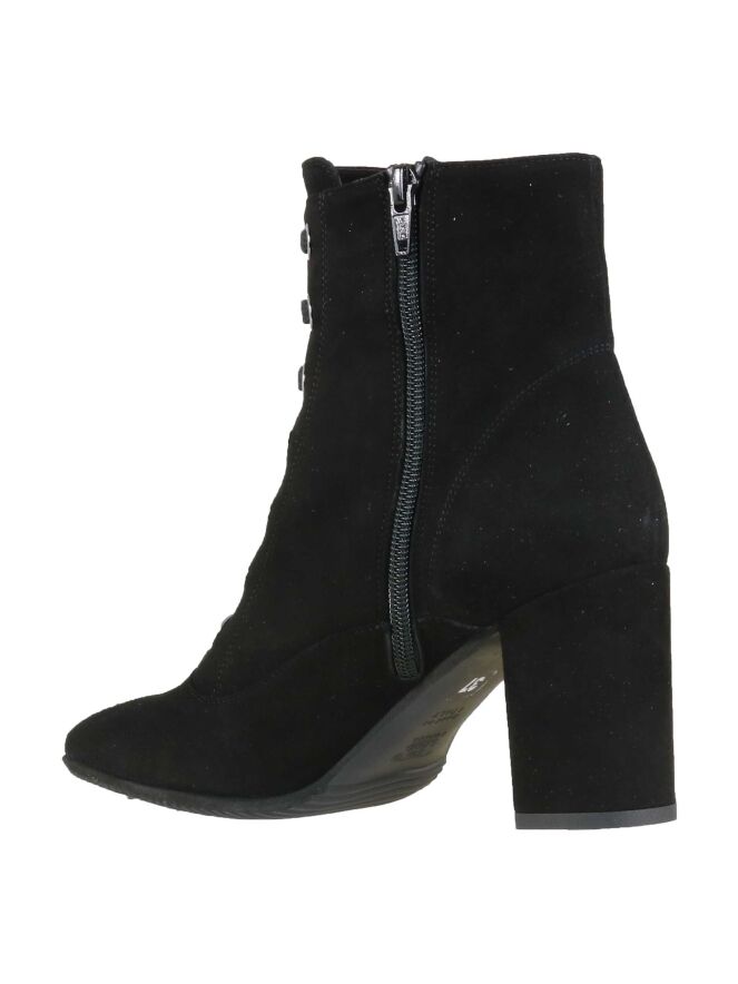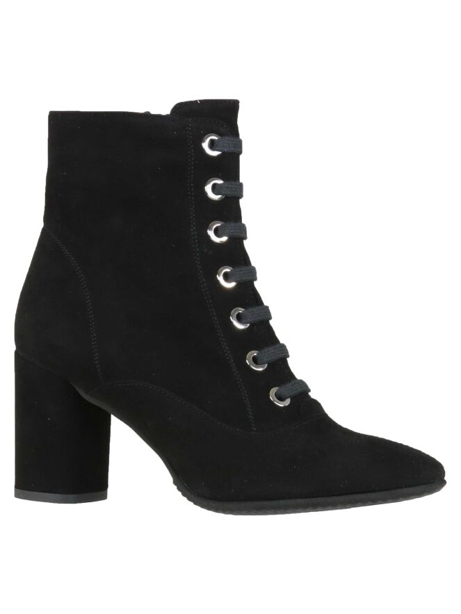 An ankle boot from Cervone in a black color. The boot is in an old school model and has a slender toe and a round block heel that is covered in the same material as the boot. The boot has a false lace with silver colored rings at the inset. The inside is lined with leather.