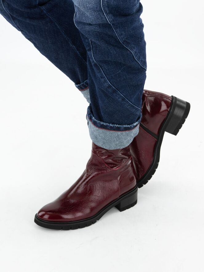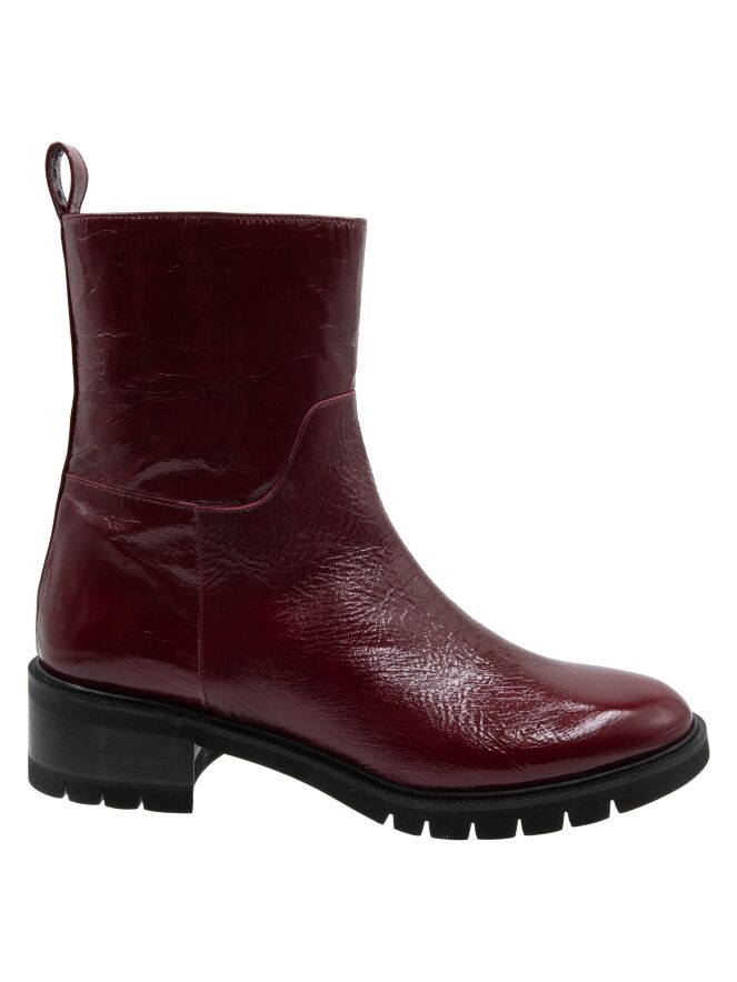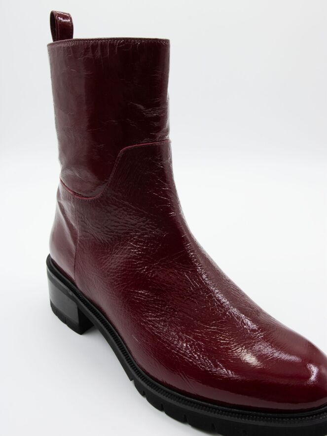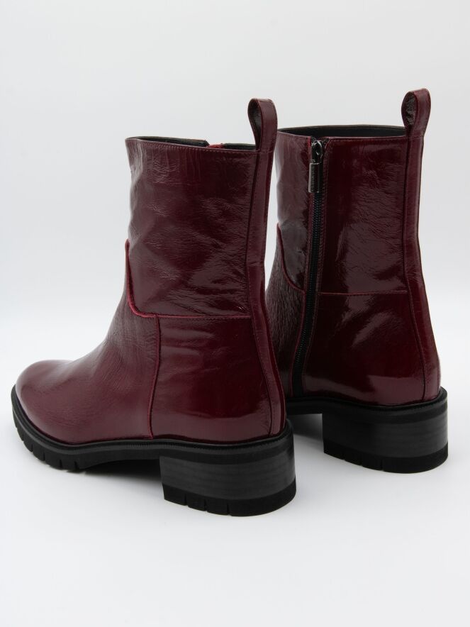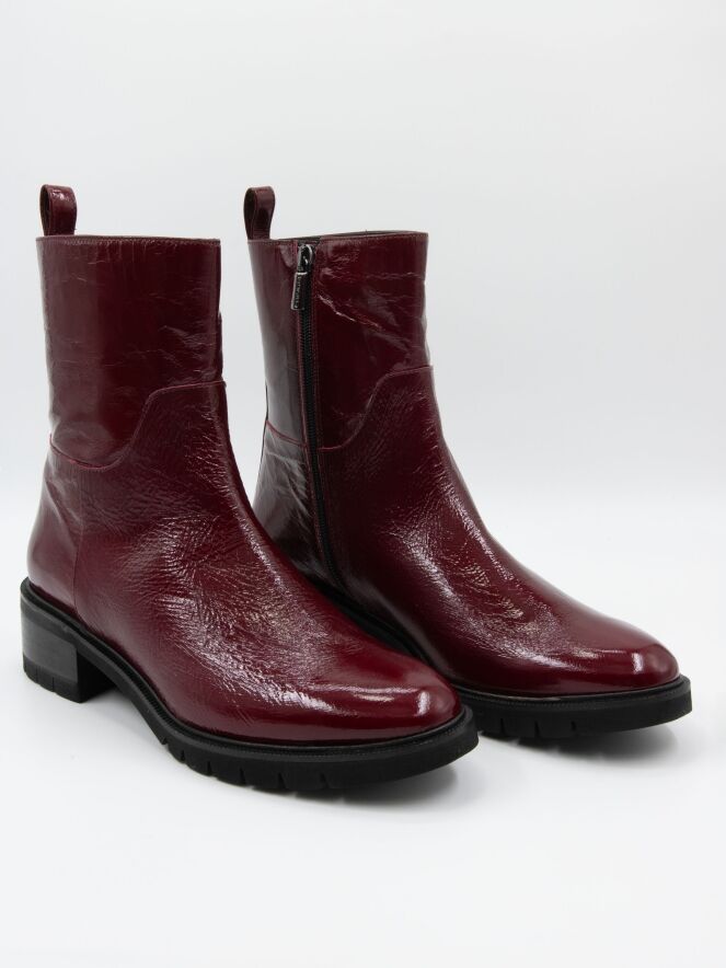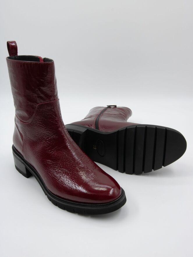 An ankle boot by Cervone in crinkle patent leather quality in burgundy color. Along the edge of the sole is a narrow welt. The heel is partially wood-colored and partially black. On the inside, there is a zipper, and the interior is lined with leather.