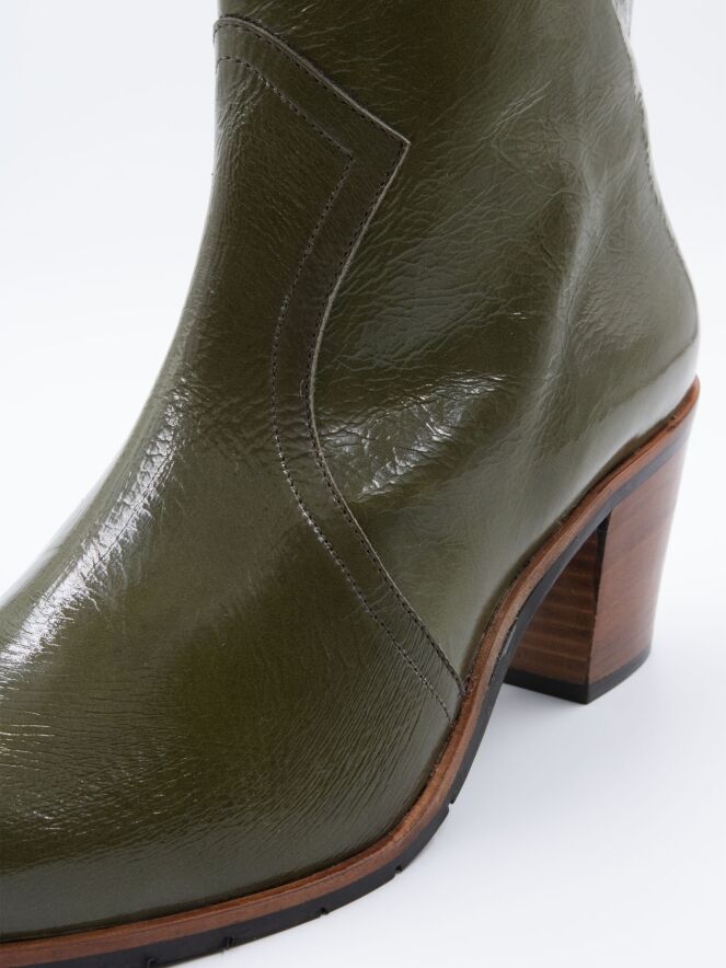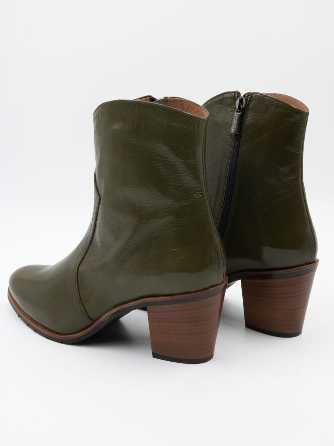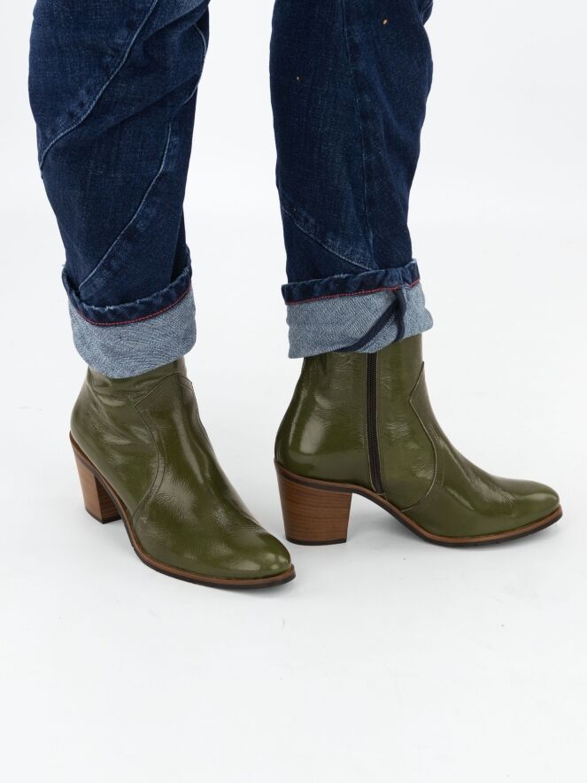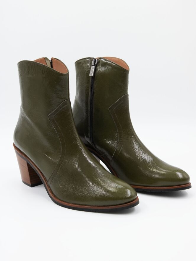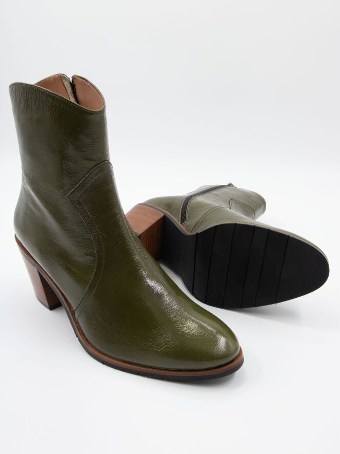 A short western ankle boot by Cervone in crinkle patent leather quality in olive green color. The boot has a slim toe and a zipper on the inside. The interior of the boot is lined with leather.