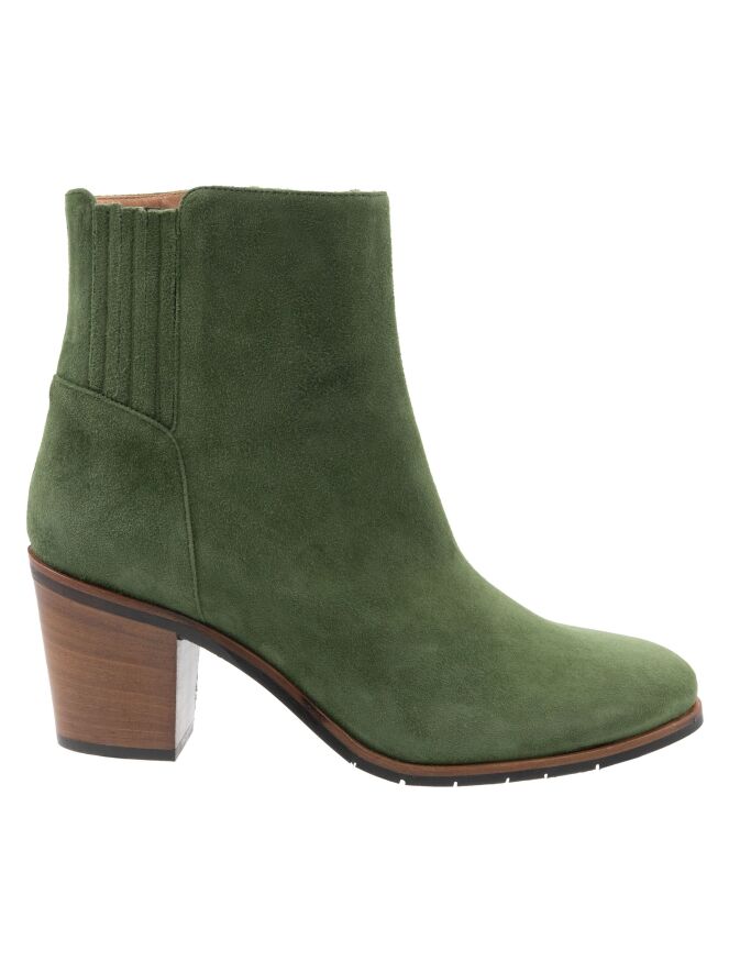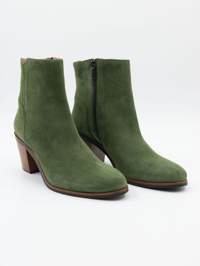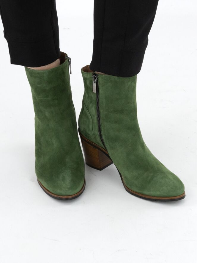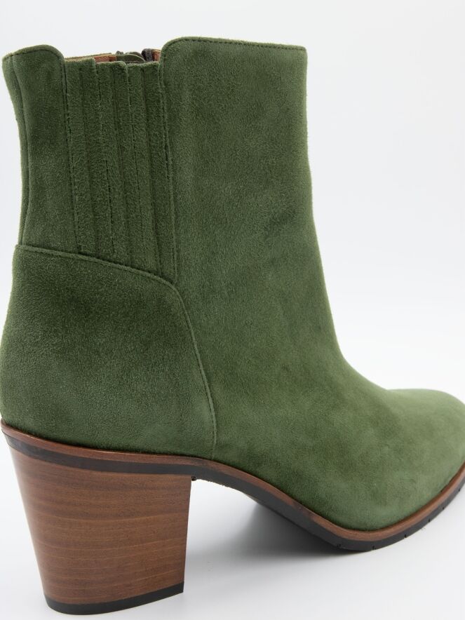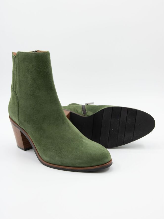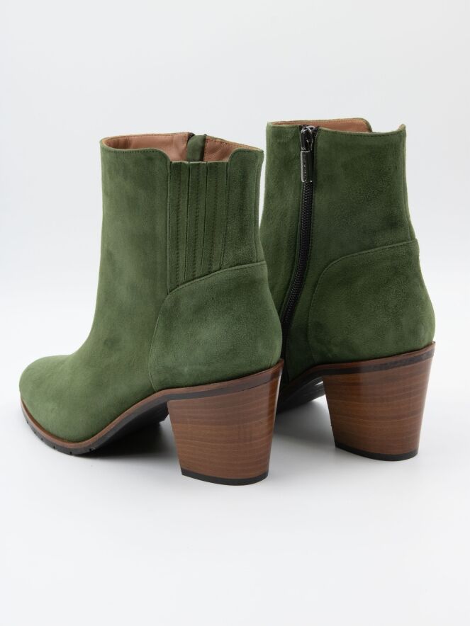 A short western boot by Cervone in olive green color. The boot has a slender toe and a zipper on the inside. At the back of the shaft, the leather is cut with an elastic band behind it. The interior is lined with leather.