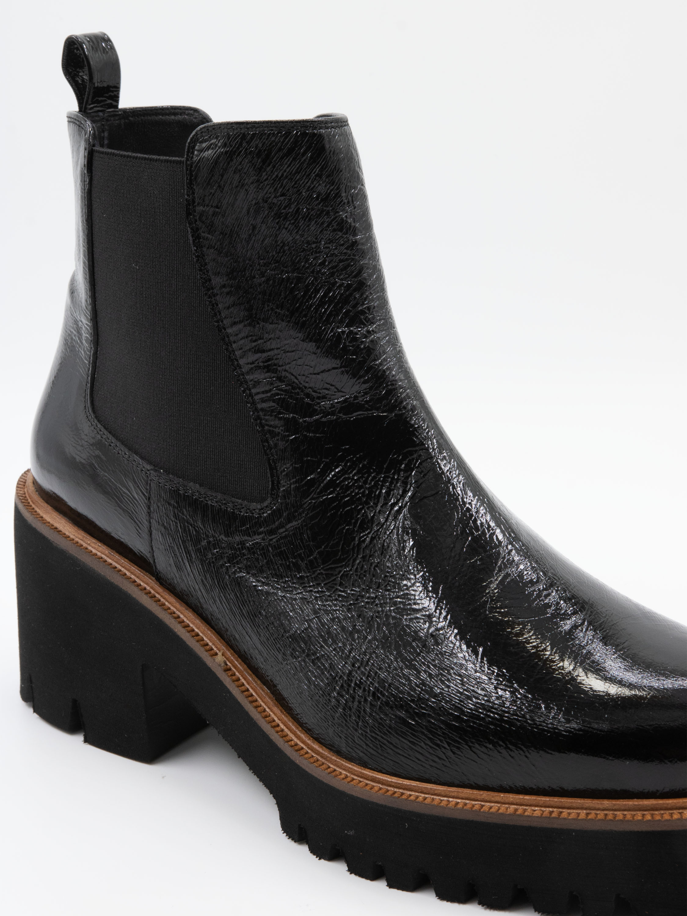 An ankle boot by Cervone in crinkle patent leather quality in black color. Along the edge of the sole is a narrow decorative welt. There is elastic in the sides of the shaft. The sporty sole with the block heel is ridged. The interior of the boot is lined with leather.