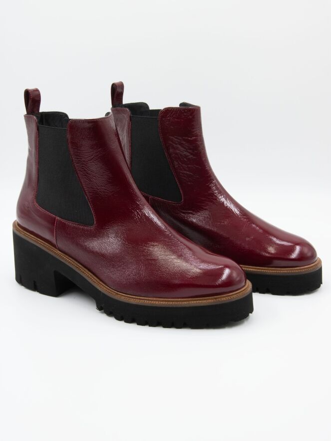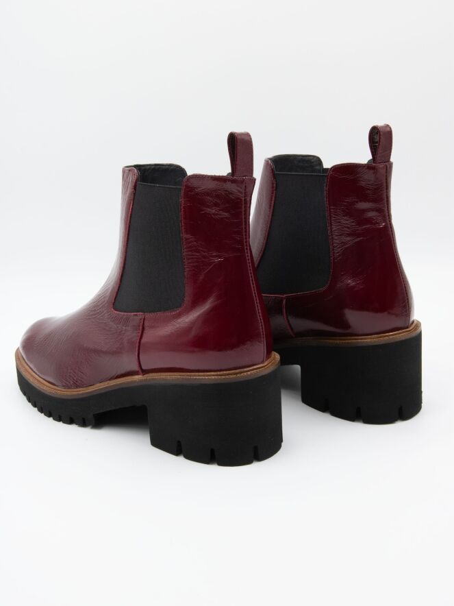 Een enkellaarsje van Cervone in een kreuklak kwaliteit in de kleur bordeauxrood. Langs de rand van de zool is een smalle decoratieve pitrand. In de zijkanten van de schacht is elastiek. De sportieve zool met de blokhak is gekarteld. De binnenkant van het laarsje is met leder gevoerd.