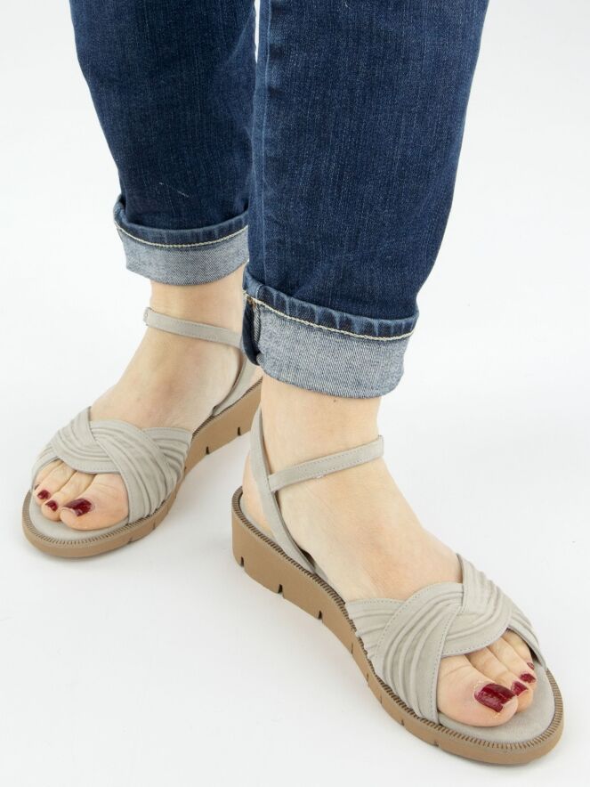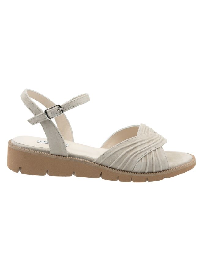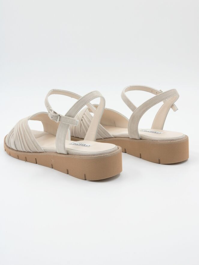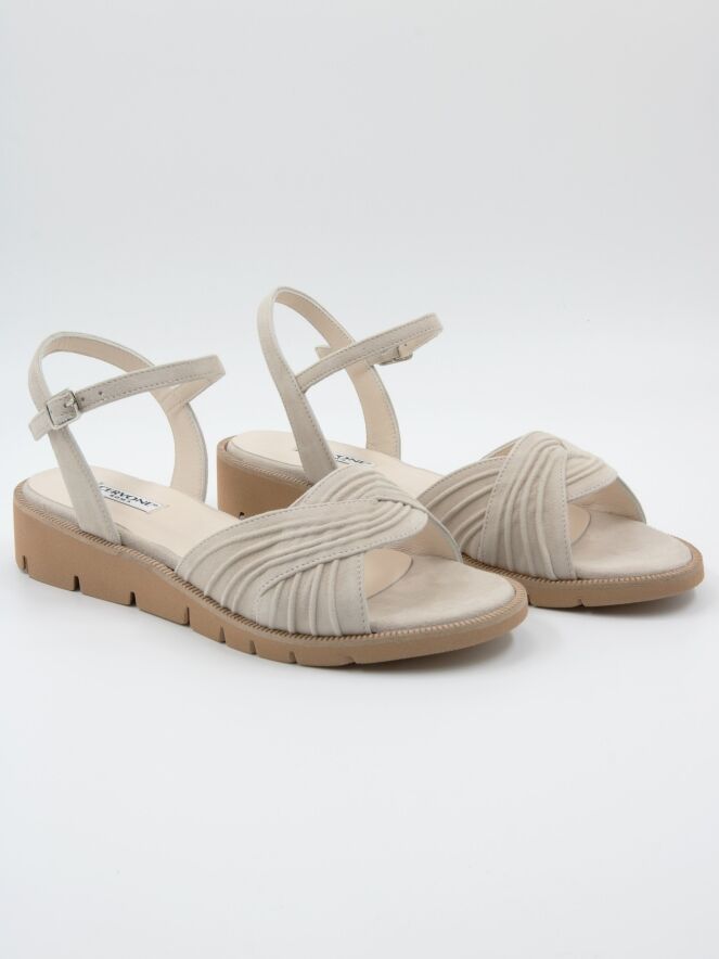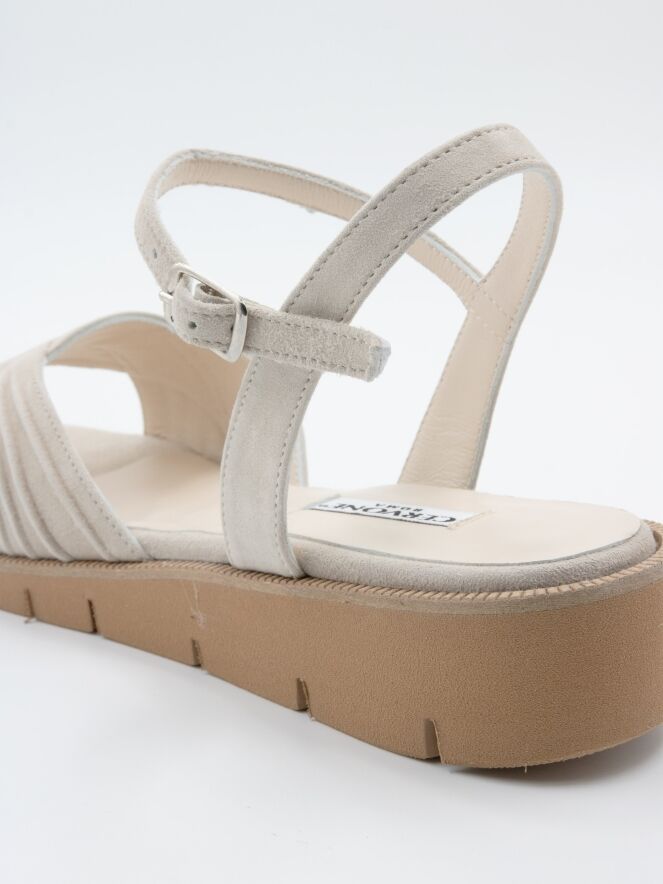A sandal from Cervone in a beige color. The two ribbed suede bands over the forefoot are crossed. The ankle strap is adjustable. The sole is in a sand color.