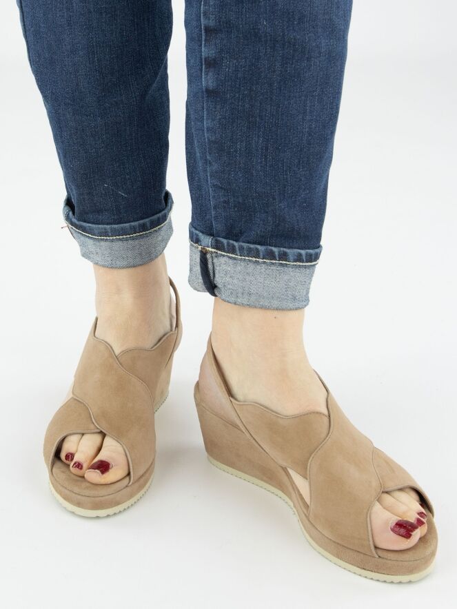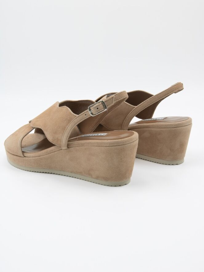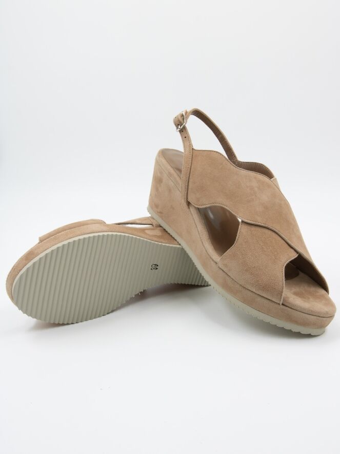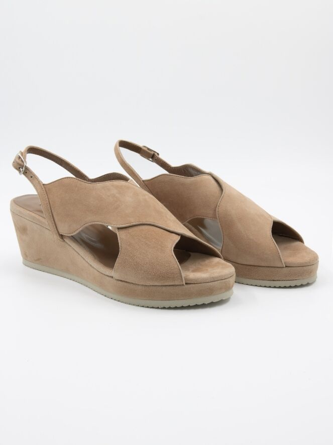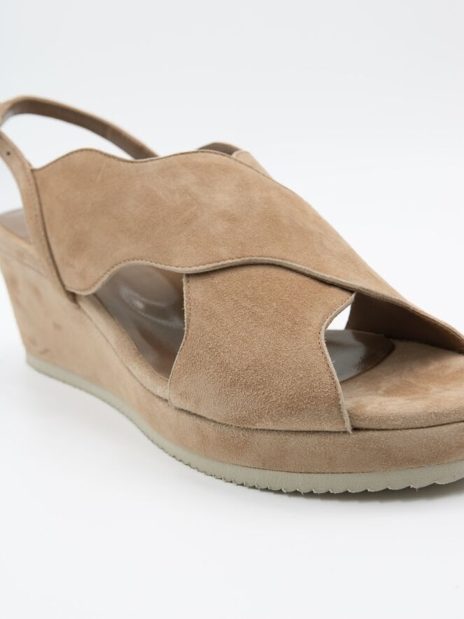 An open sandal from Cervone in a soft camel color. The edges of the crossed band are in a wavy line. The heel strap is adjustable.