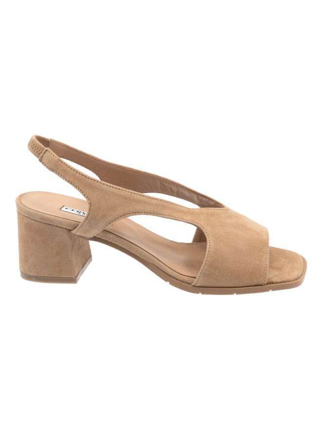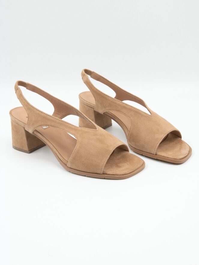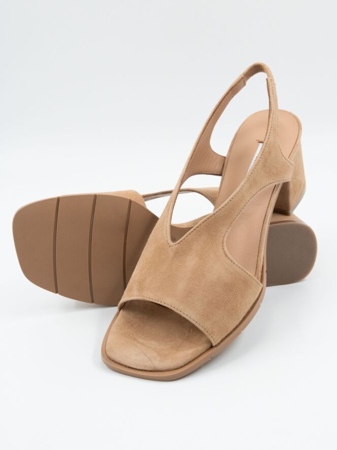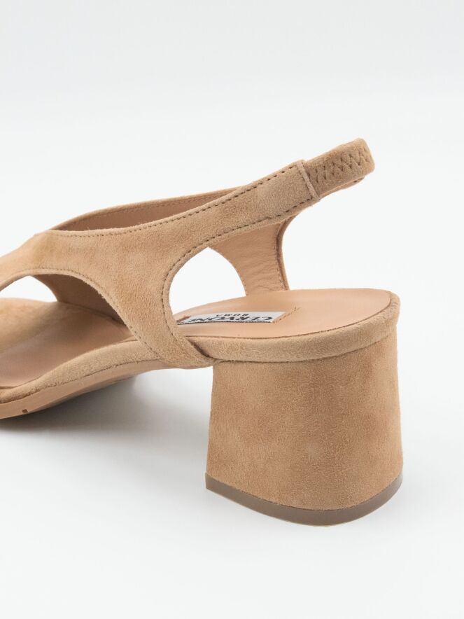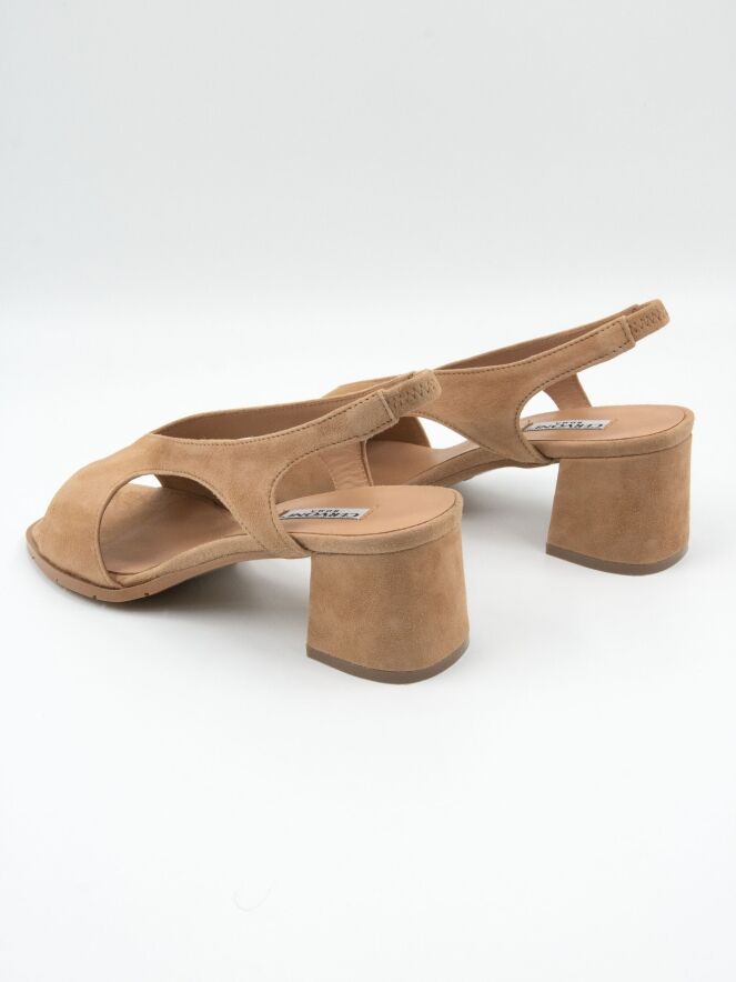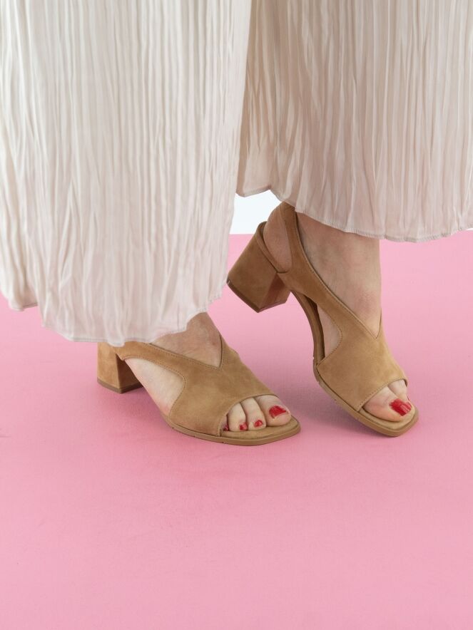An open-toe sandal from Cervone in a soft camel color. The heel strap is elastic. The block heel is covered in the same material as the sandal.