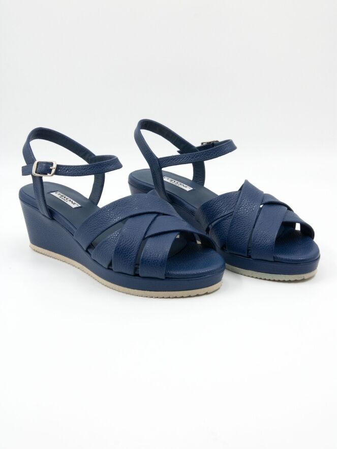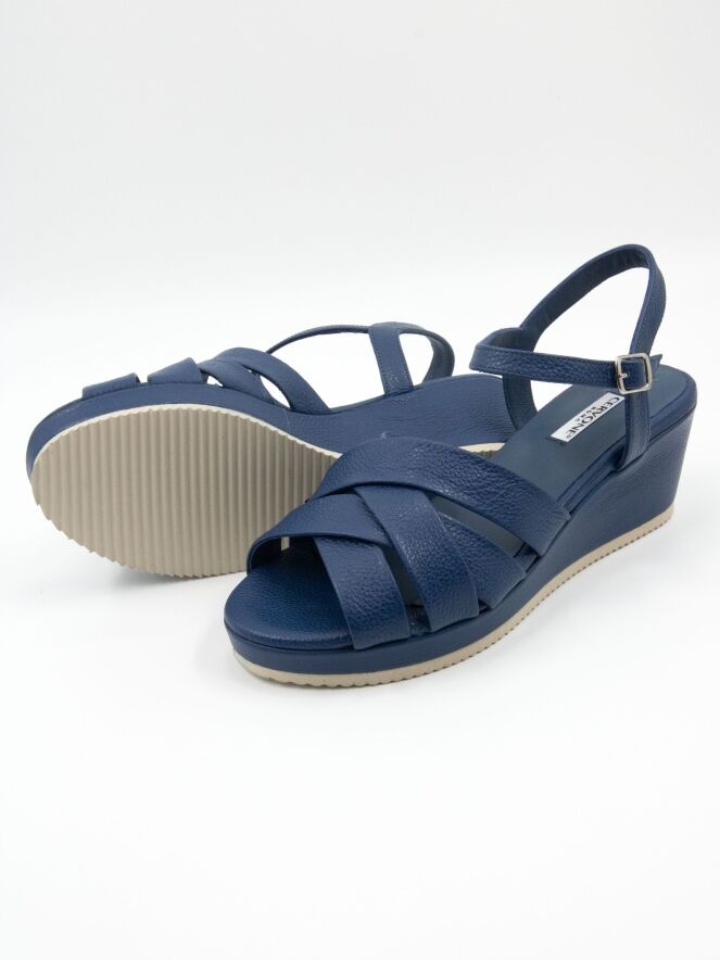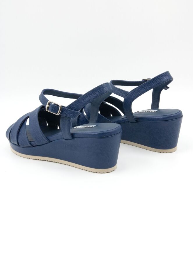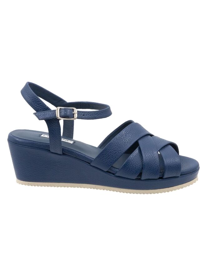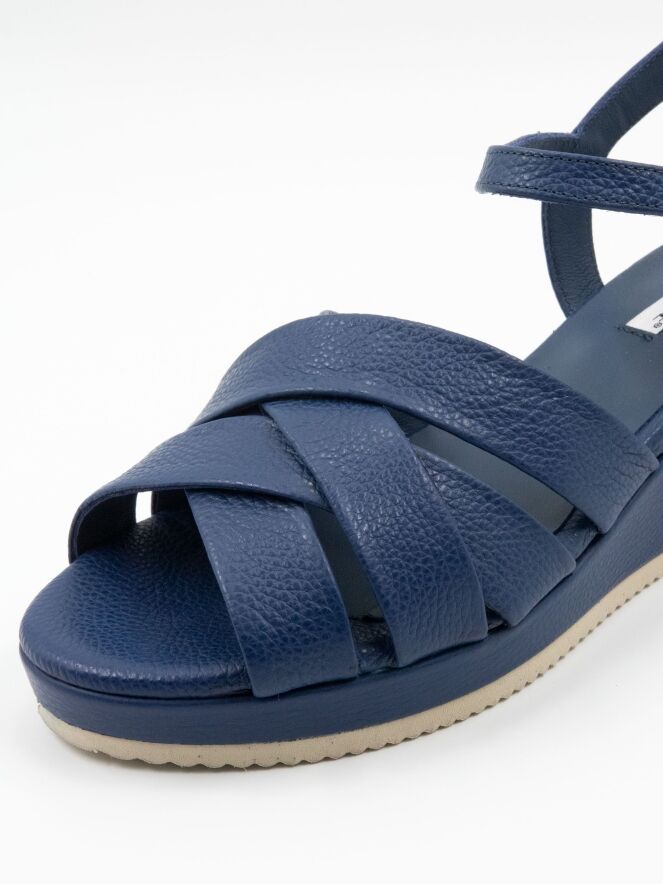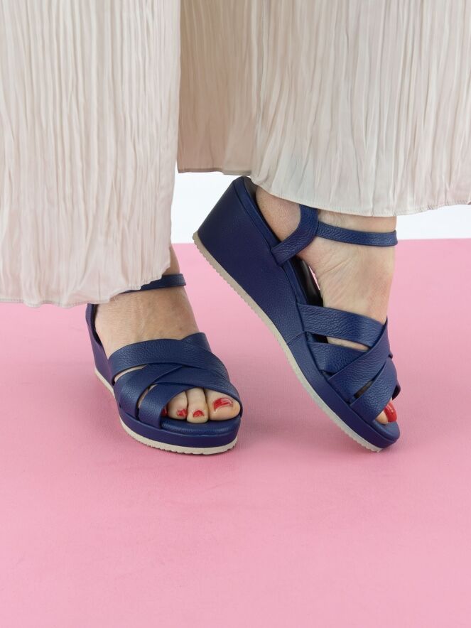 A sandal from Cervone in cobalt blue. The sandal features five crossed straps over the forefoot and an adjustable ankle strap. Beneath the wedge heel, which is covered in the same leather as the sandal, is a finely serrated white sole edge.