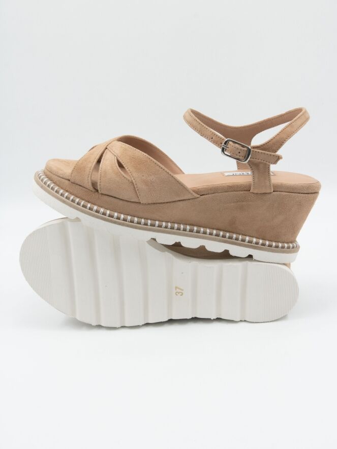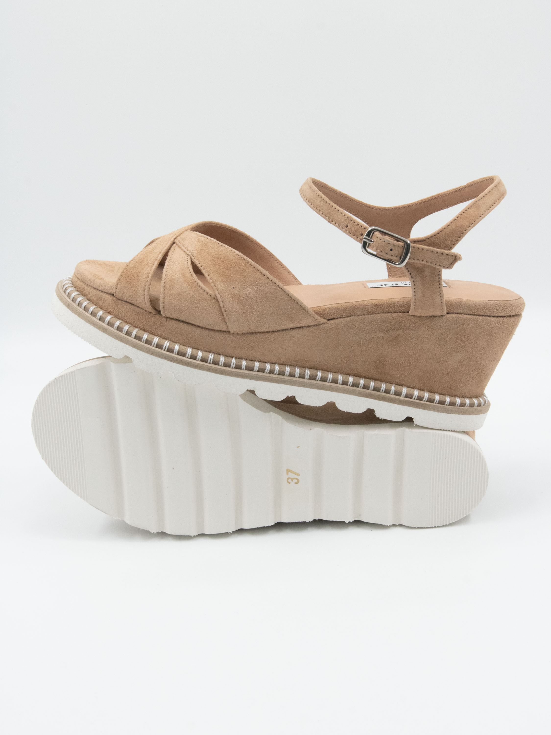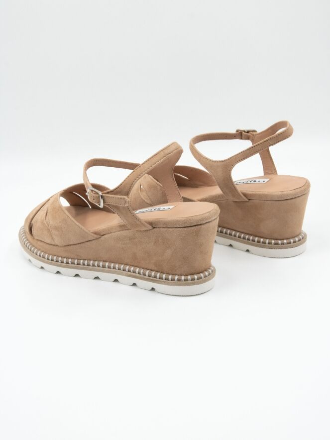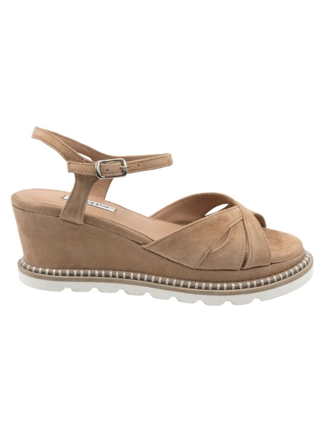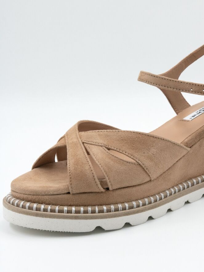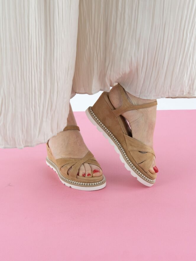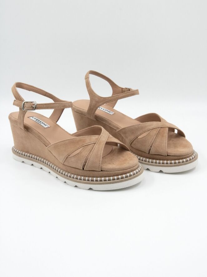 A wedge sandal from Cervone in a soft camel color. The sandal features crossed straps over the forefoot and an adjustable ankle strap. Along the edge of the white sole runs a round jute trim in a sand color, with decorative white stitching wrapped around it.