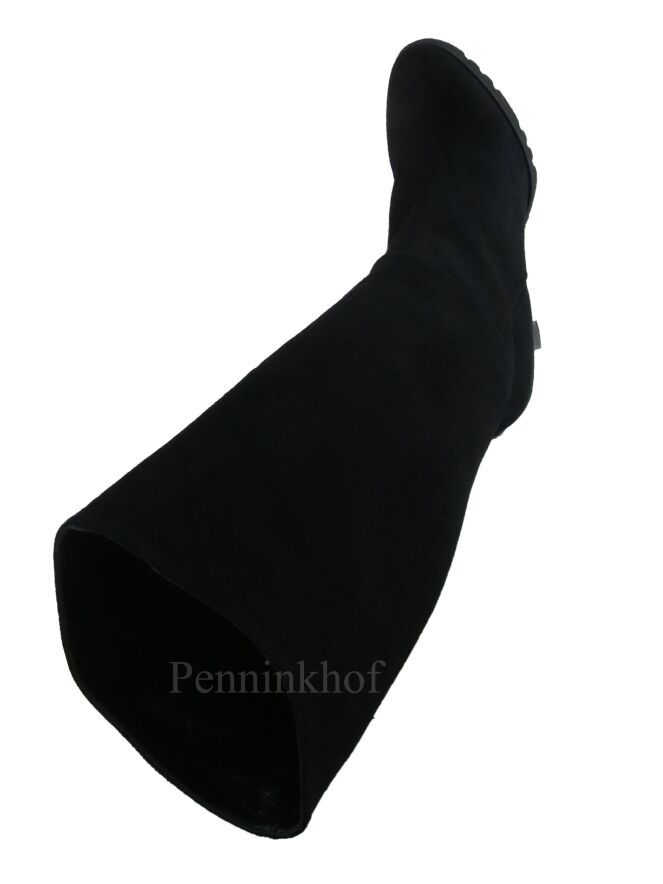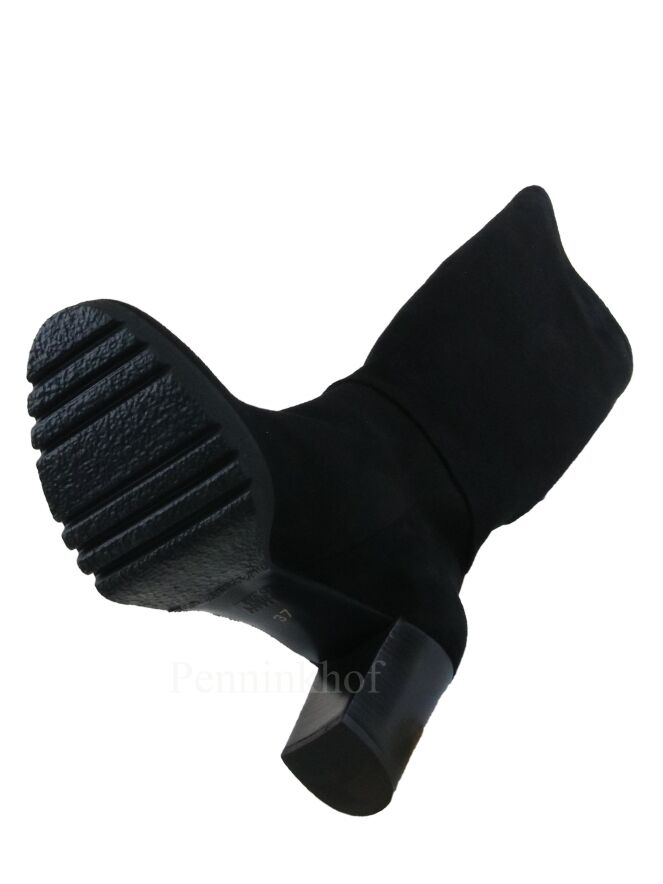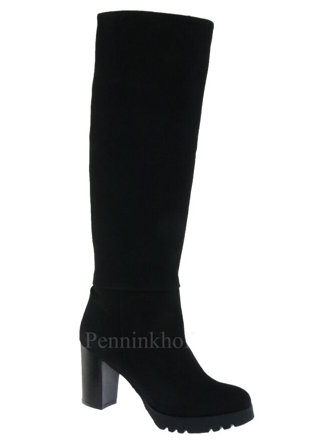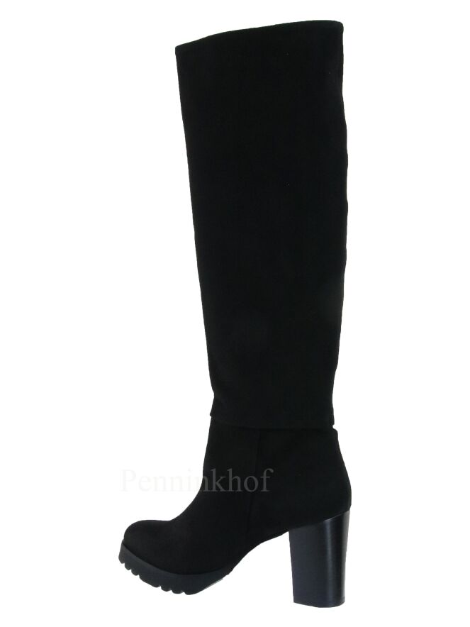A luxurious high boot from Cervone in the color black. The boot has a serrated platform sole and an elegant block heel. Above the ankle is a horizontal stitching seam. The inside is lined with leather.