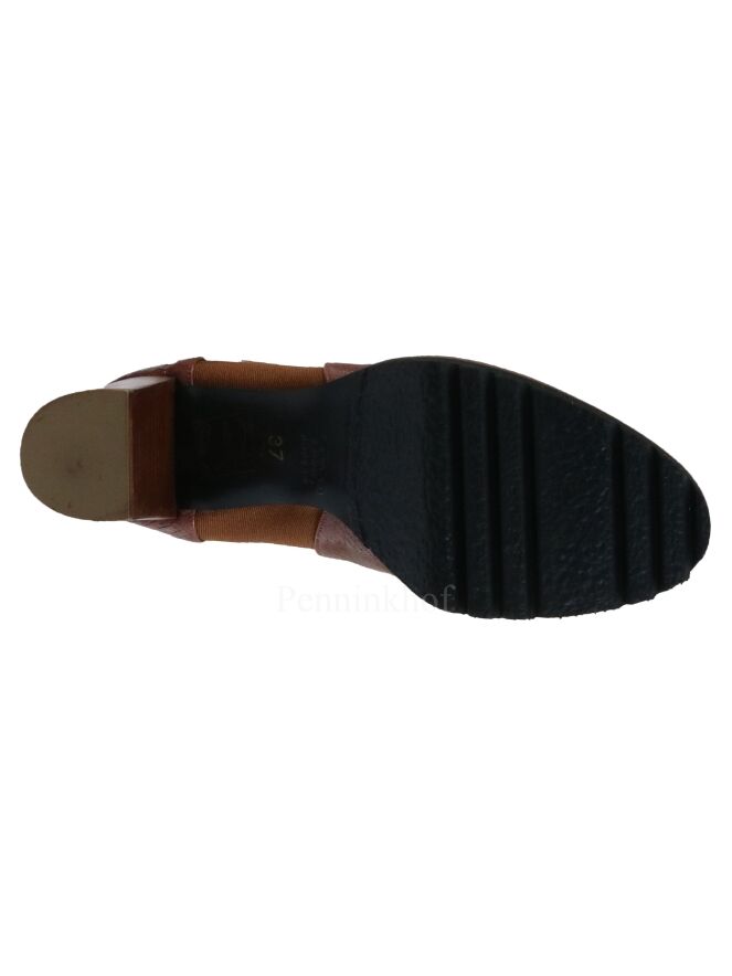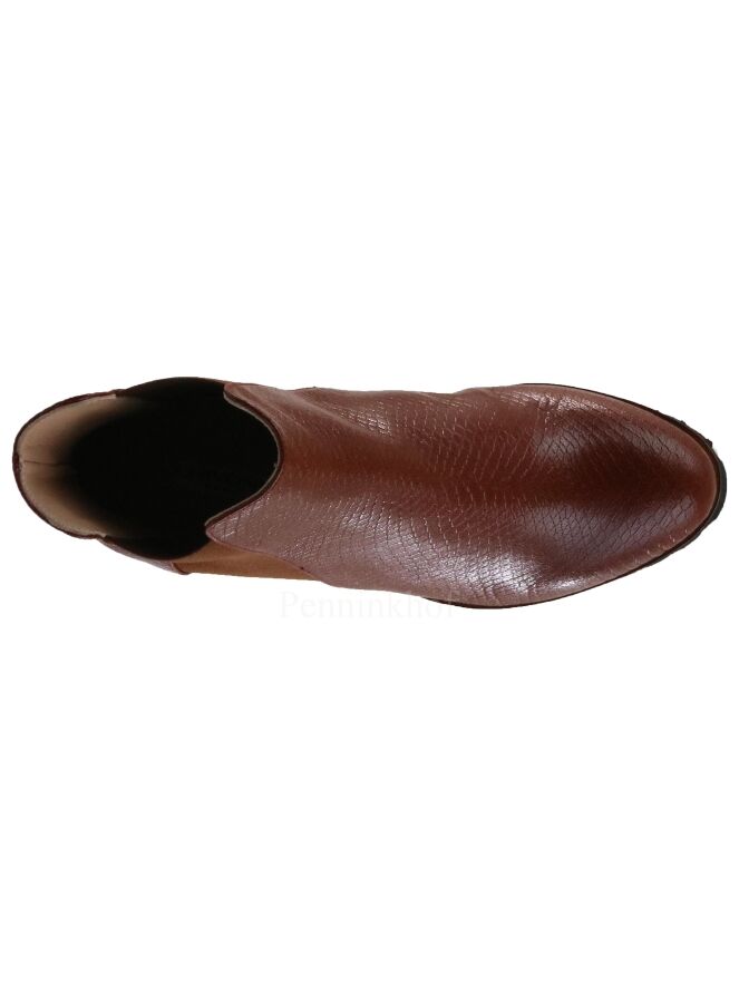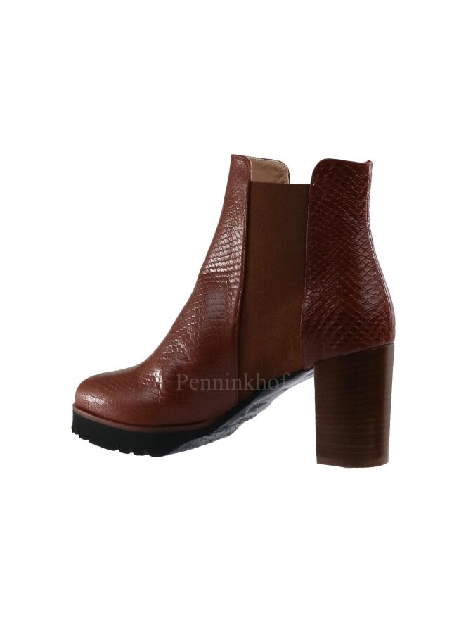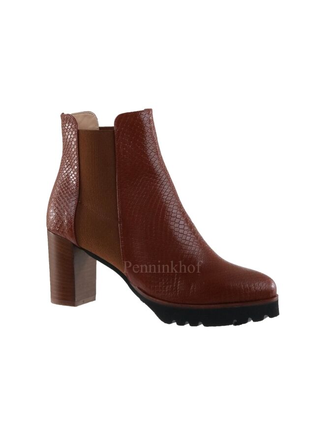 A short boot from Cervone in a reptile structure with the color cognac. Along the sides of the shaft is an elastic fabric. The serrated sole is black in the color. The inside is lined with leather.