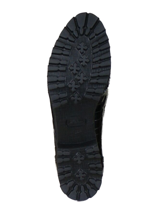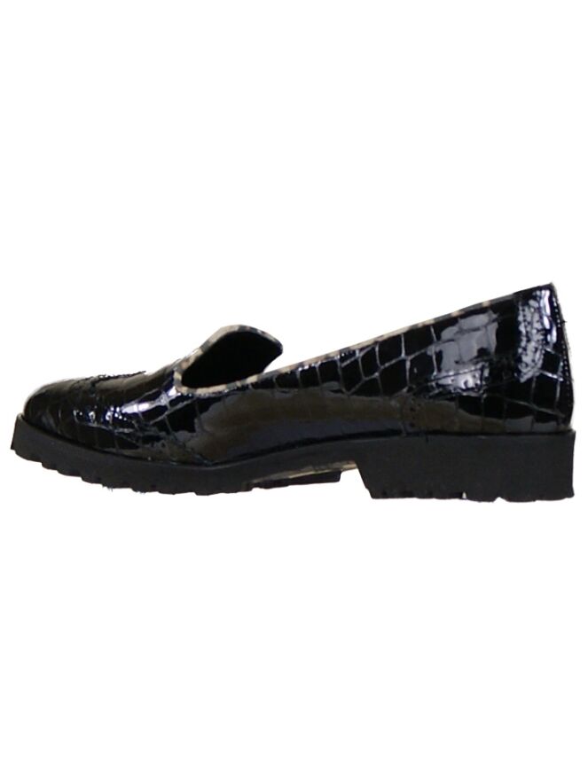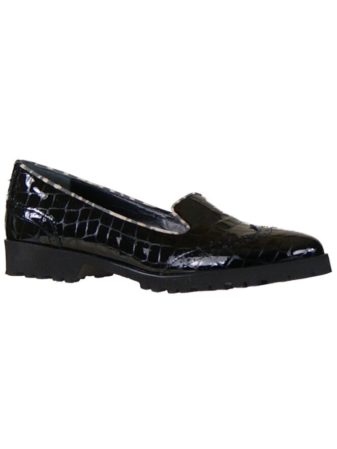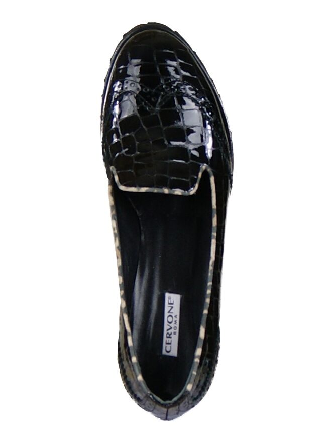 A loafer by the brand Cervone in the colour black. The leather is in a croco print and the toe is with a brooks lining finished. This detail comes back on the heel. Along the edge of the shoe is in a leather trim with a Panther print processed. The inner side of the slip-on leather lined.