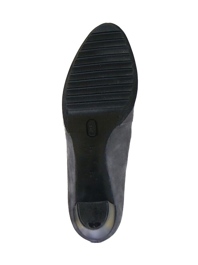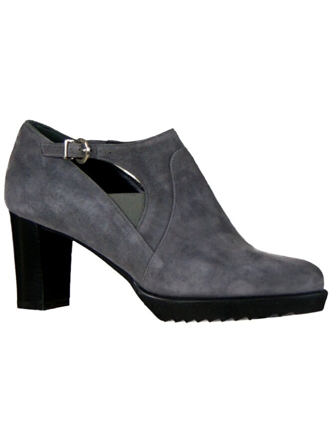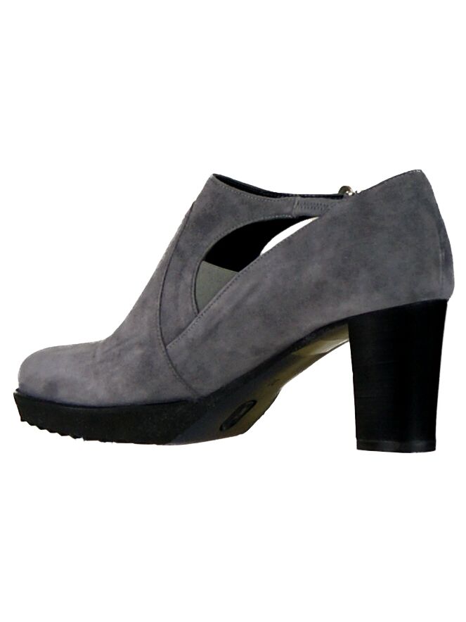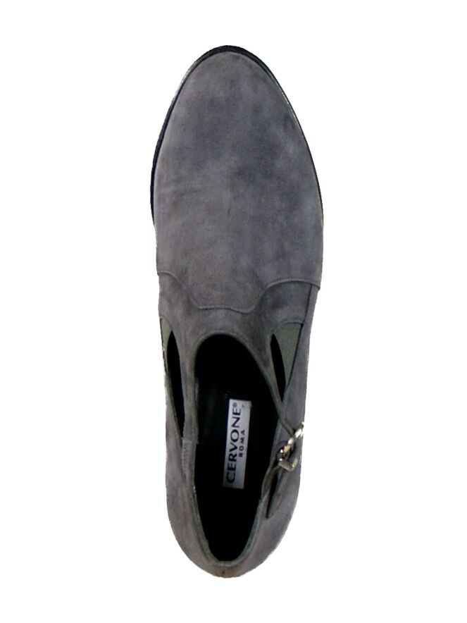 A pump by the brand Cervone in the color grey. The platform sole has a small cartel edge. The heel is carried out in neutral black. On the outside of the pump is a small buckle and the sides are cut away. The inside of this pump is lined with leather.