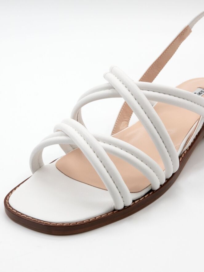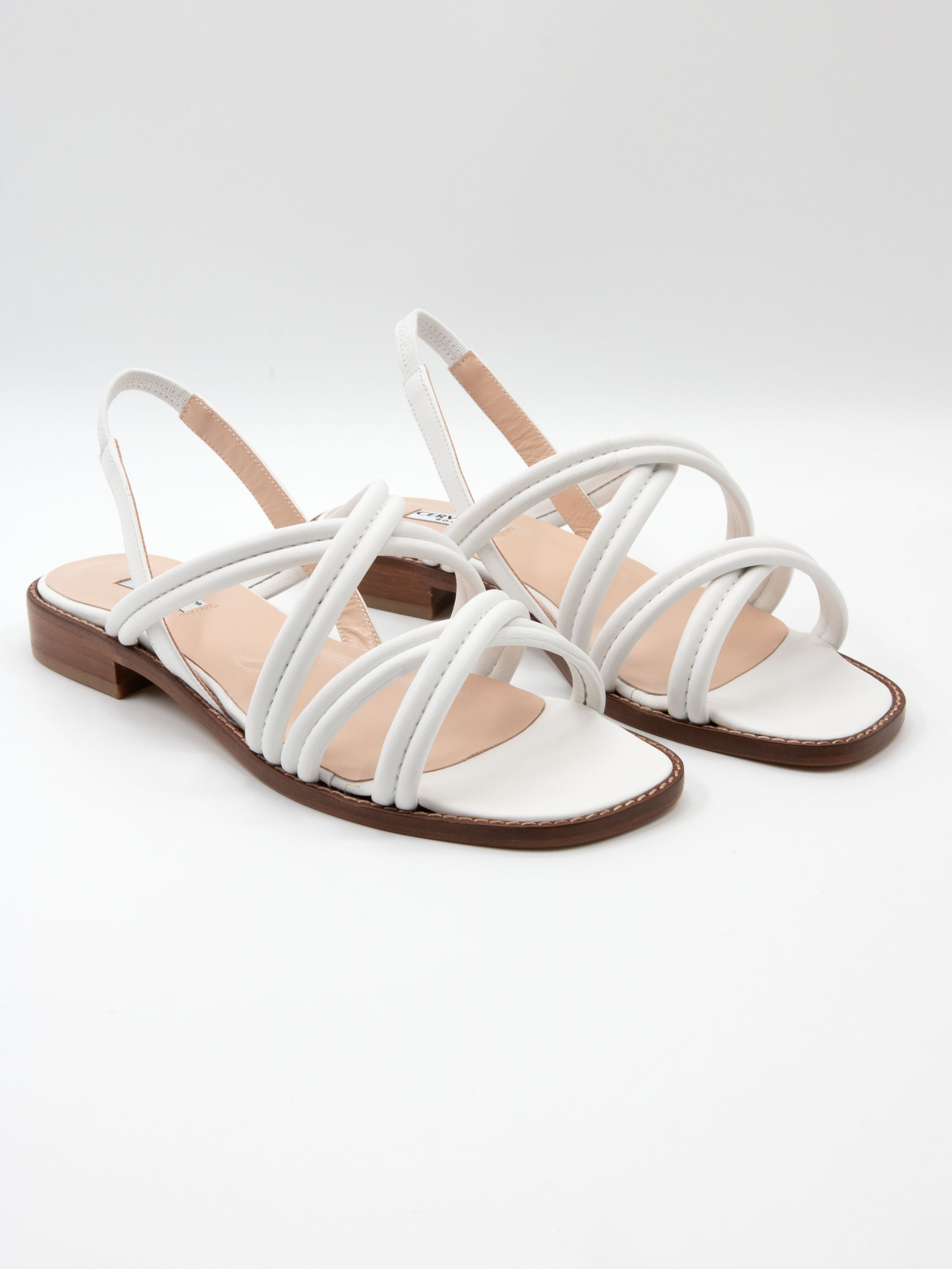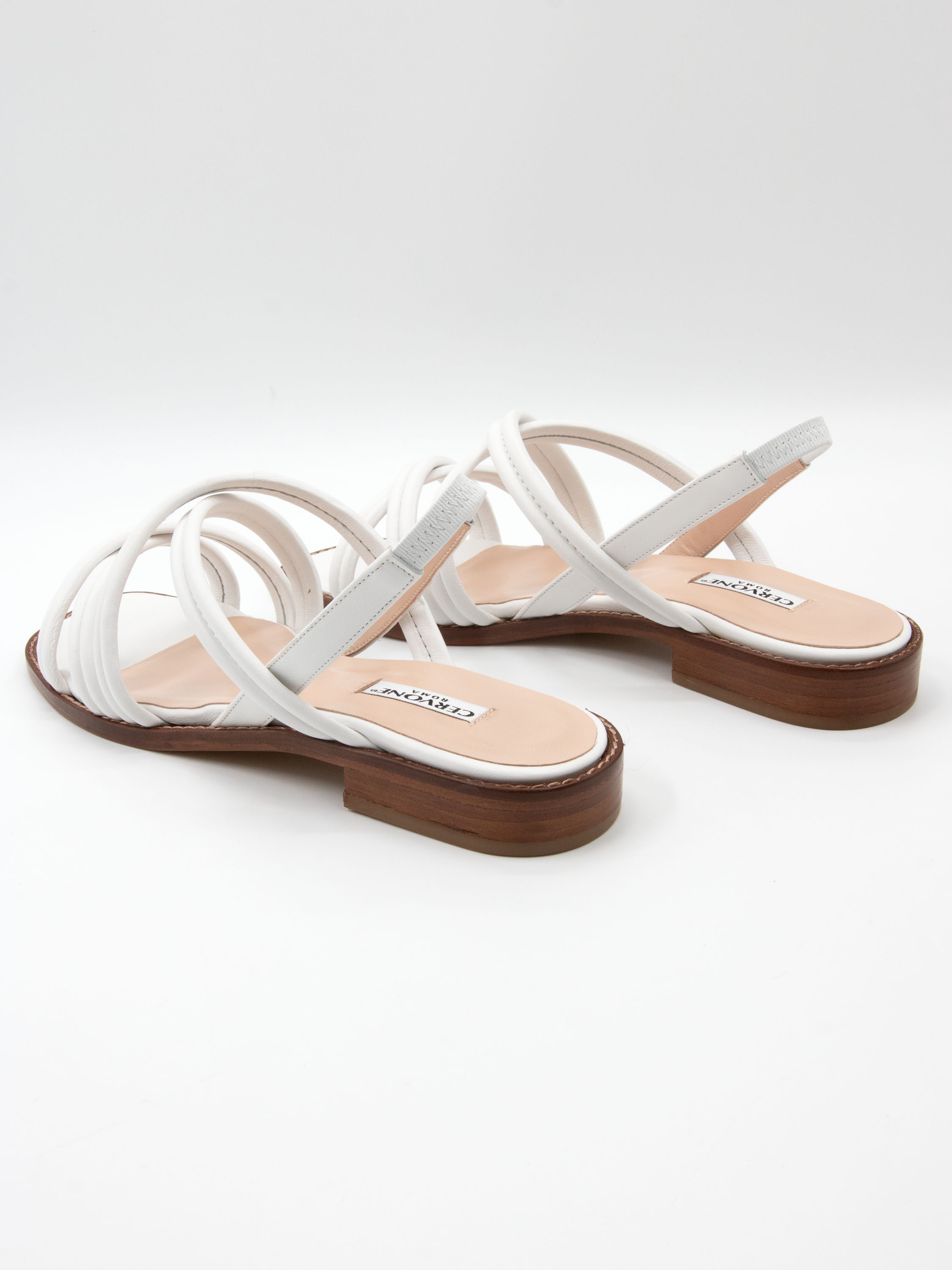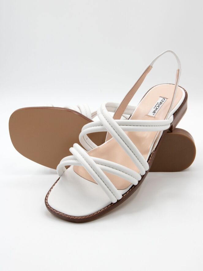 An open sandal by Cervone crafted from white nappa leather. Double crisscross straps run across the forefoot, creating an elegant look. The heel strap is elasticated at the back for added comfort. A small wood-toned heel ensures a comfortable fit throughout the day.