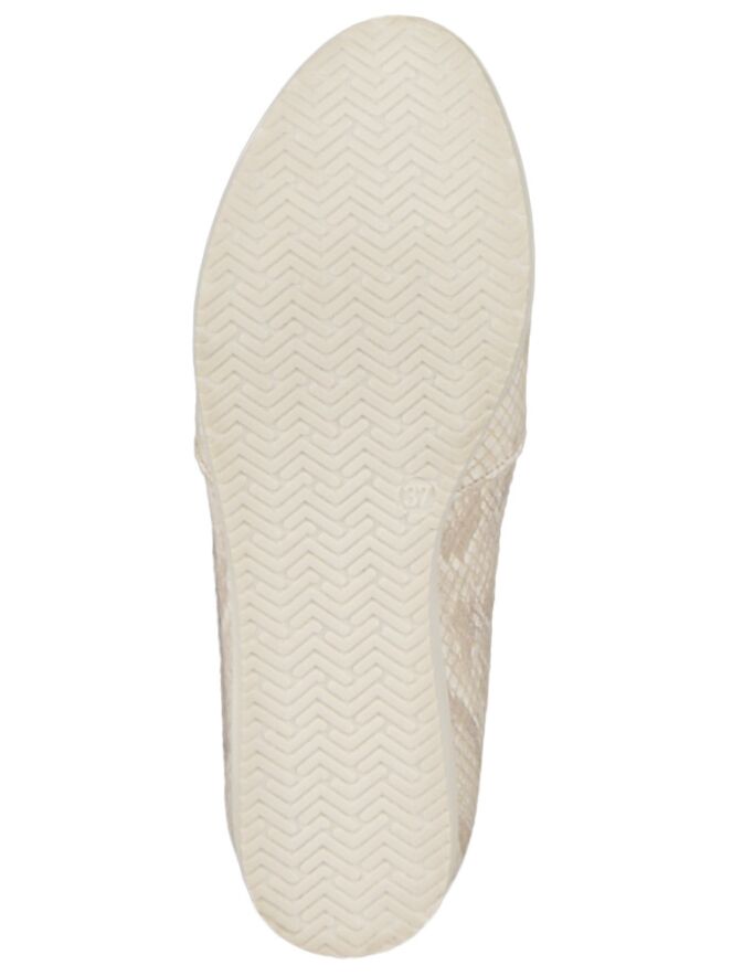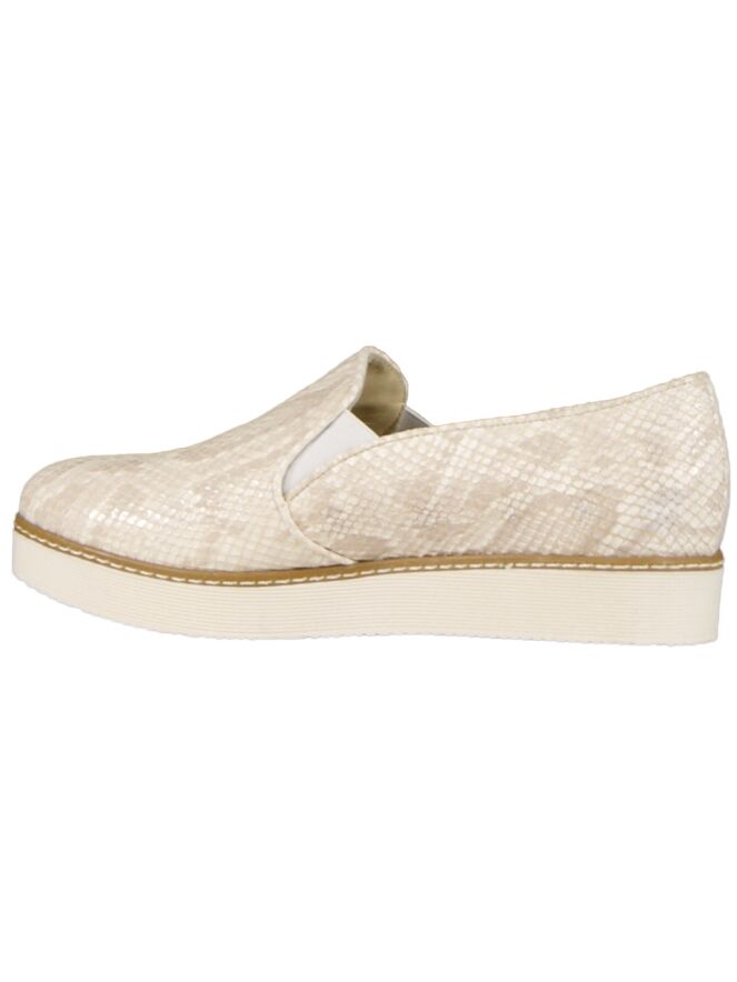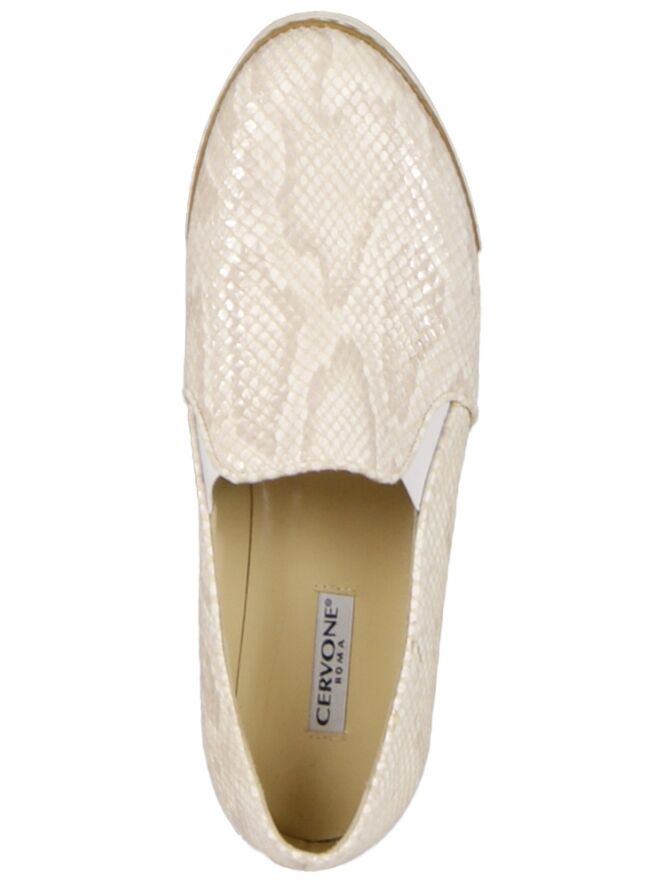 A loafer of the brand Cervone run in a beige -coloured snake print. The shoe is a white sole of 2 cm high. Above the sole is a narrow camel band that is quilted. This slip-on is lined on the inside with leather.