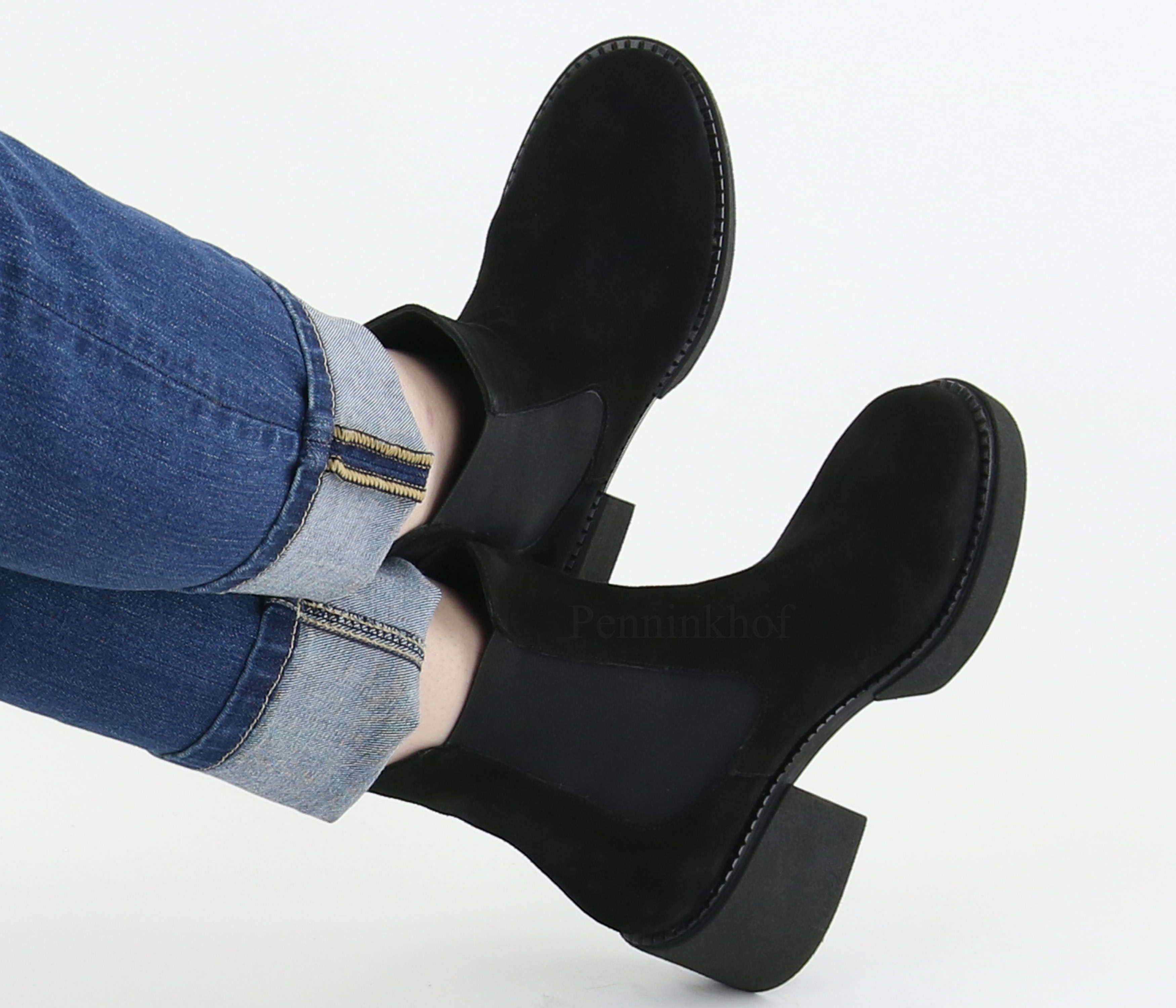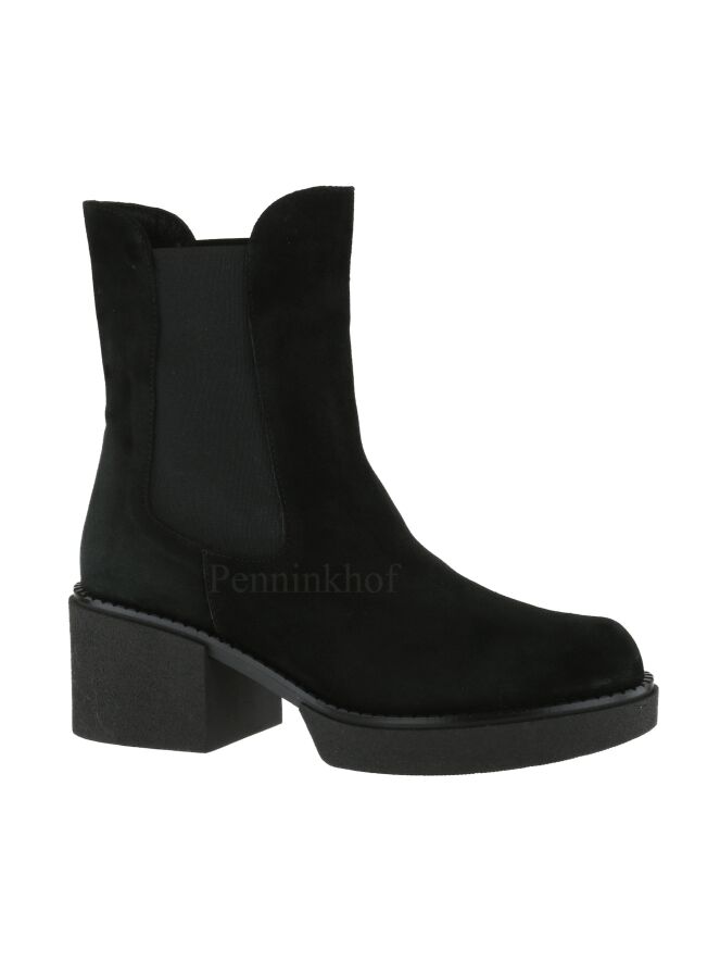 An ankle boot from Cervone in the color black. The boot has a block heel and on both sides of the shaft are elastic pieces of fabric. The inside is lined with leather.
