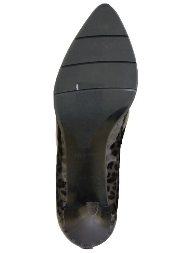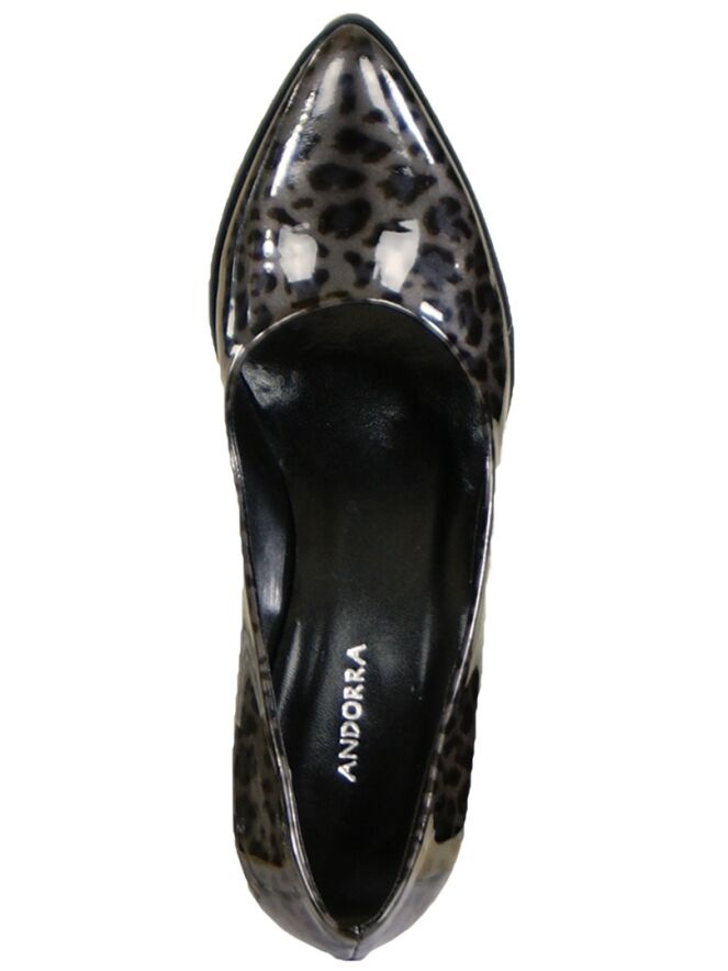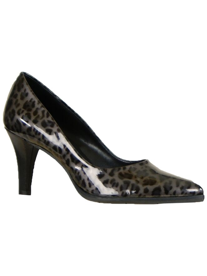 A pump by the brand Cristian Daniel in a leopard print with the colors antracite and black. The material is of patent leather. The heel is elegant and slim. The pump has a leather inner lining.