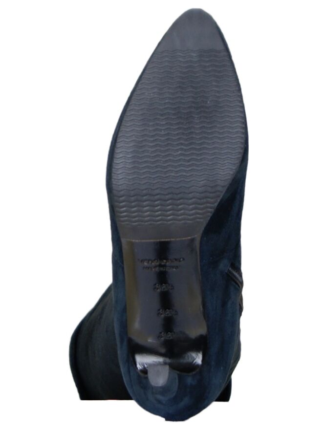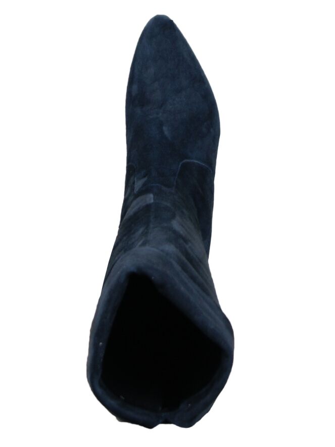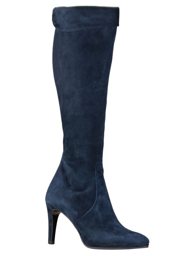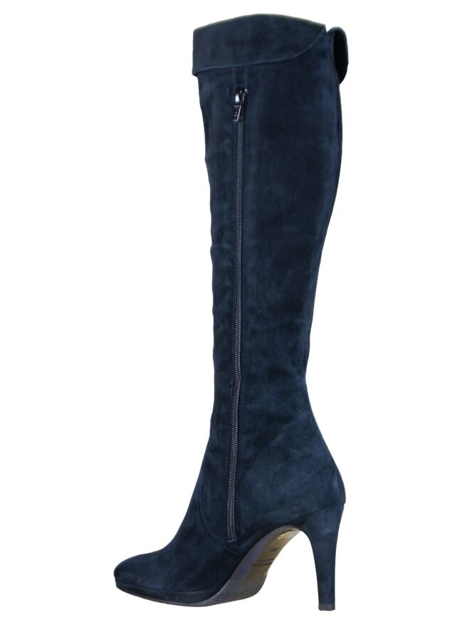 A tub boot by the brand Cristian Daniel in the color navy bleu. The boot has a pointed toe and on the inside of the shaft is a zipper along the entire length of the shaft. At the size 37 is the measure of the shaft width 34 cm, and the length of the shaft from the sole is 41 cm. The valve on the shaft is on the inside of suede and can be folded. The slim heel is coated with suede.