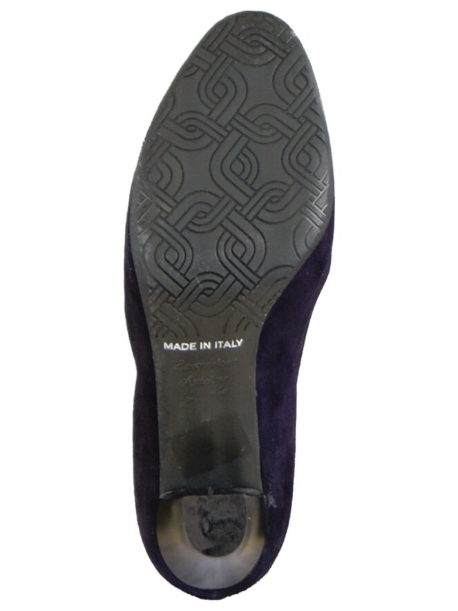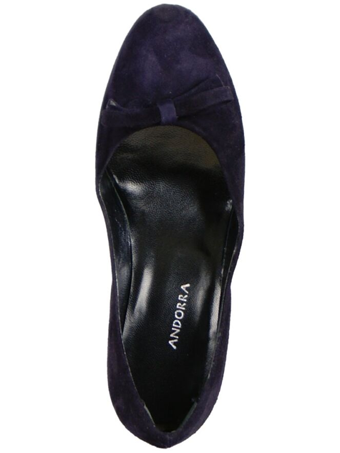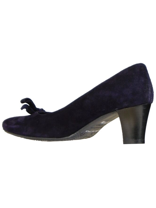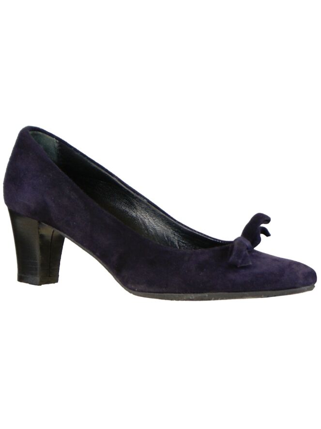 A pump of the brand Cristian Daniel in the color purple. On the forefoot is a narrow bow tie and the toe is round cut . The inside of the pump is lined with leather.