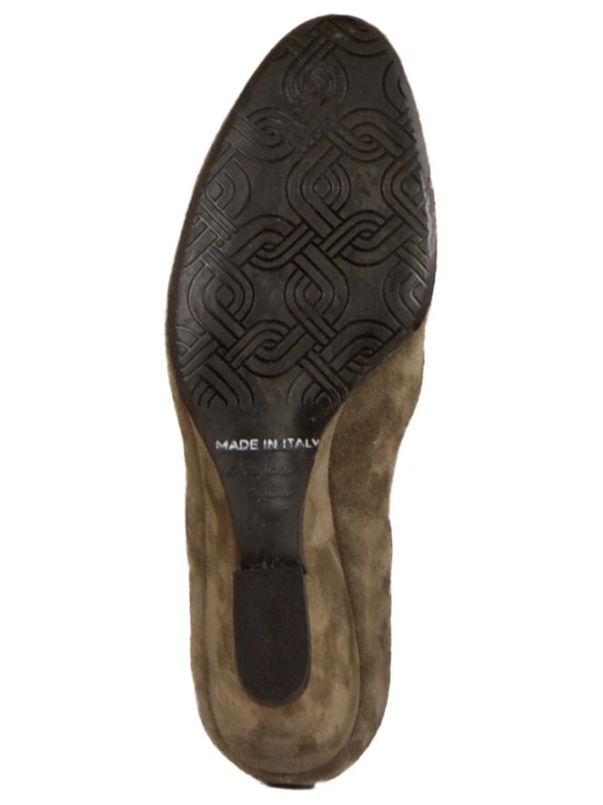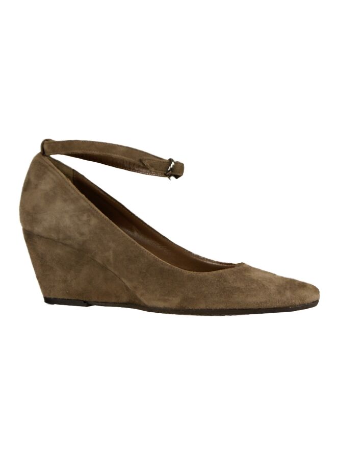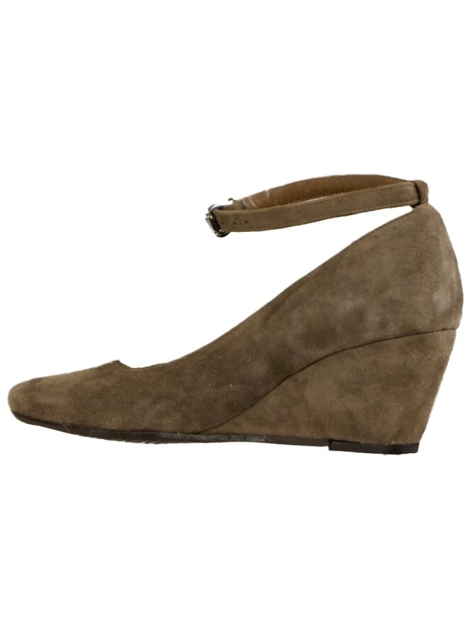 A pump on a wedge heel of the brand Cristian Daniel in the color taupe. To the heel is a ankle strap attached. The pump has a round toe and is on the inside with leather lined.