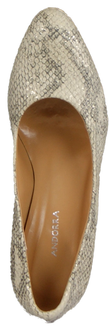 This pump by the brand Cristian Daniel is made in a sand-coloured python print with a small gold-coloured detail in metallic. The pump has a round toe and the front foot stands on a plateau of 1 cm height. The heel is covered in the same material as the pump. The inner lining is leather.