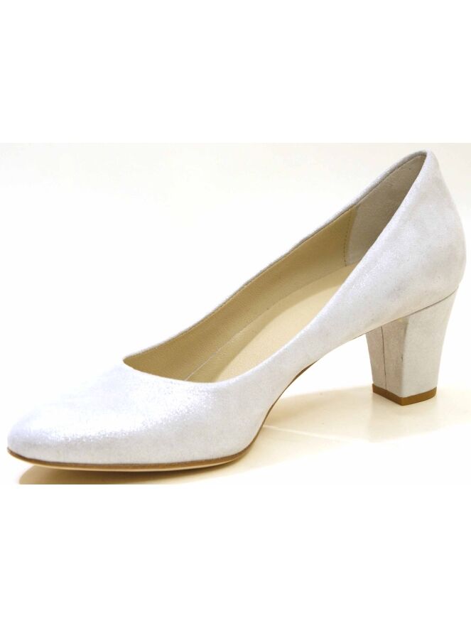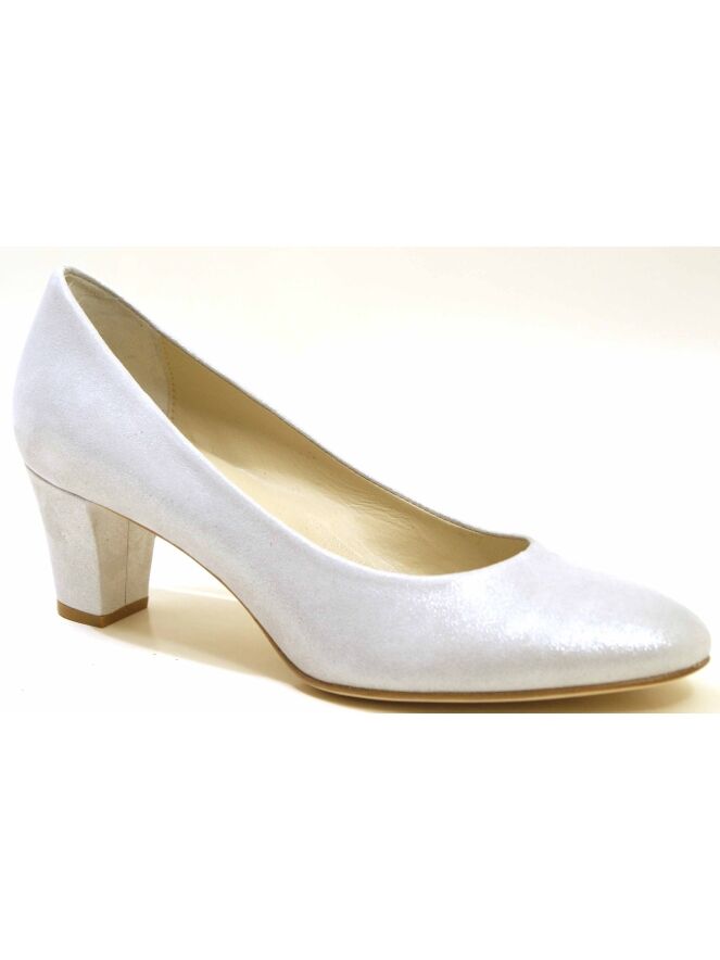 This pump from the brand Cristian Daniel is in a of white silver color. The pump has an elegant heel. The inner lining is of leather and this pump has a nice round toe.