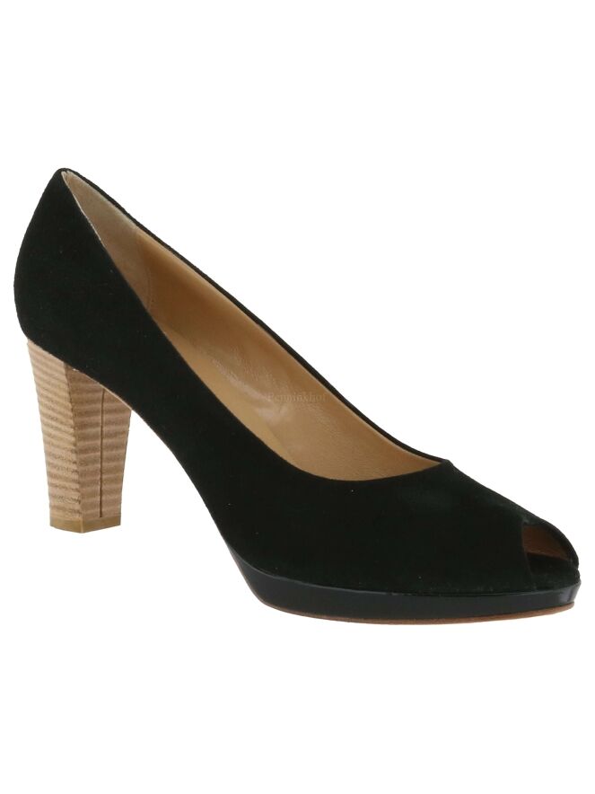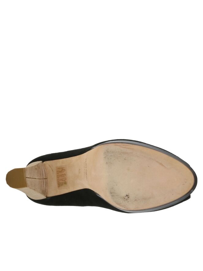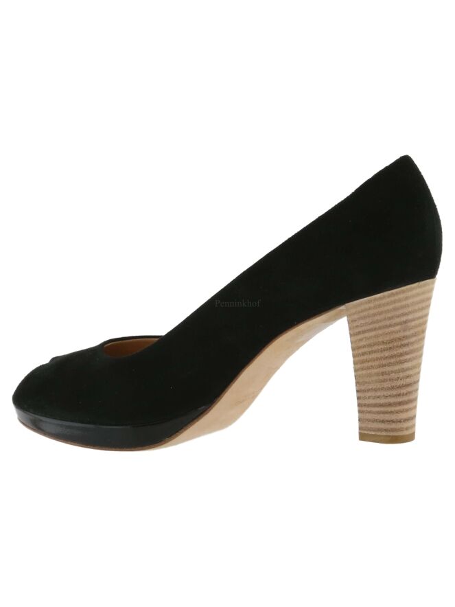 A pump by Cristian Daniel in the color black. The pump has an open toe and the platform sole is covered in the same suede as the pump. The heel is in a wood color and the inside is lined with leather.