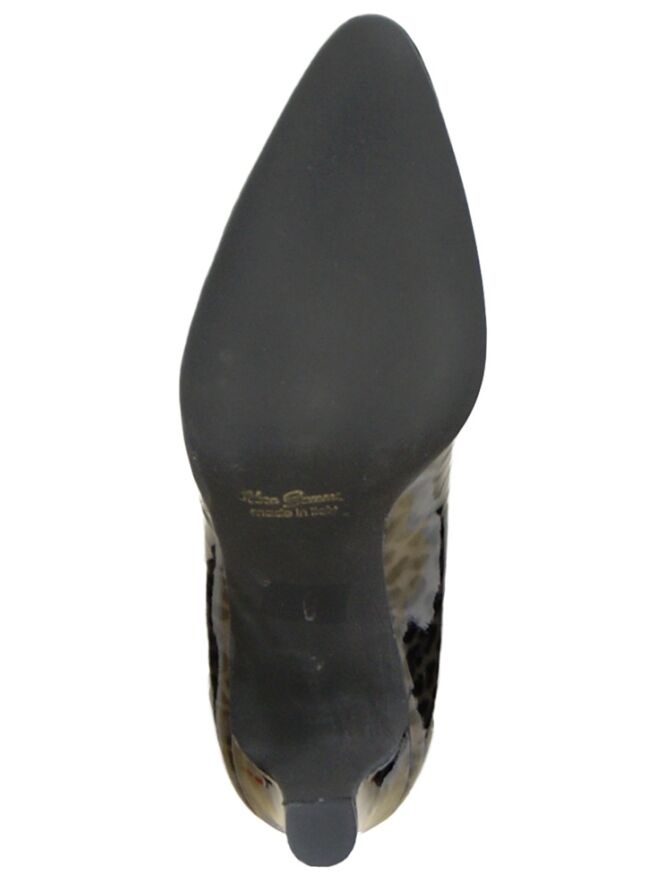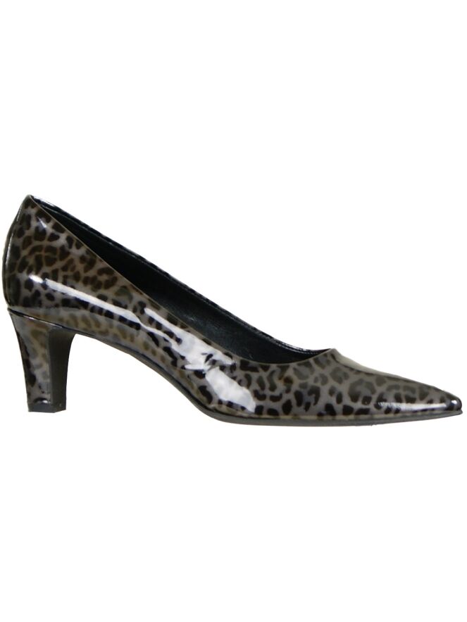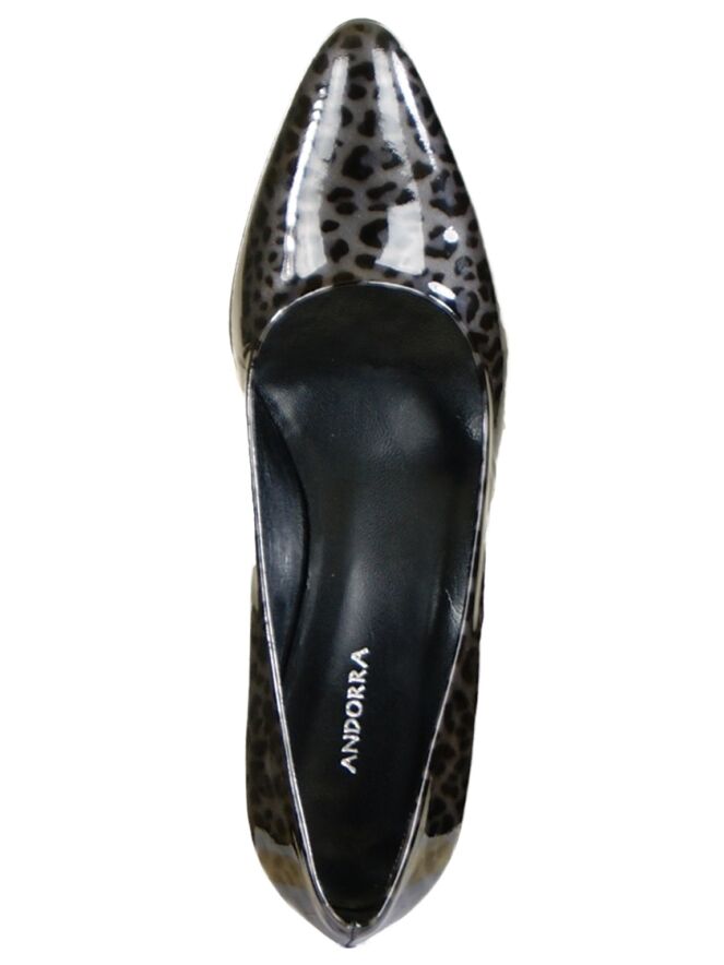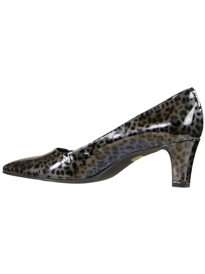 A pump of the brand Cristian Daniel in a leopard print in the color antracite with black. The material is of patent leather. The heel is elegantly slim. The pumpje has a leather inner lining and the toe is slightly tapered.