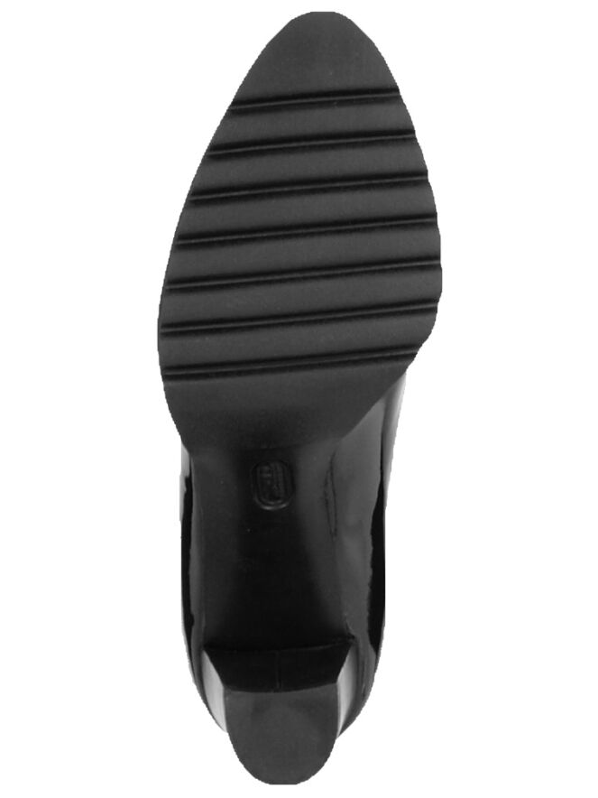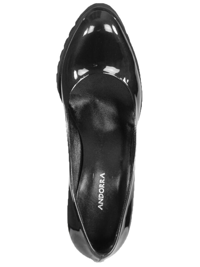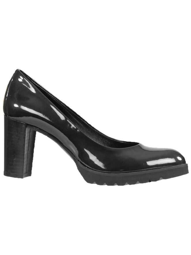 A pump in the patent leather of the brand Cristian Daniel in the color black. The pump has a round toe and a jagged sole. The pump has a block heel and the inside of the pump is lined with leather.