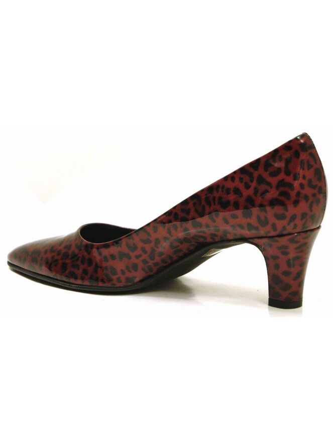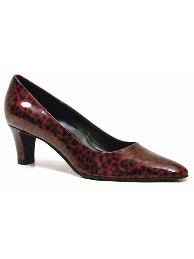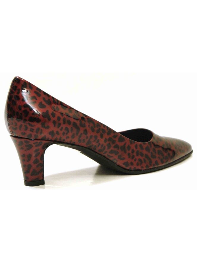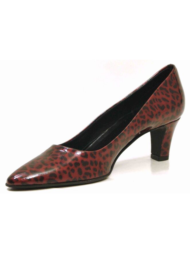 A pump of the brand Cristian Daniel in a leopard print in the color red with black. The material is of patent leather. The heel is elegantly slim. The pumpje has a leather inner lining and the toe is slightly tapered.