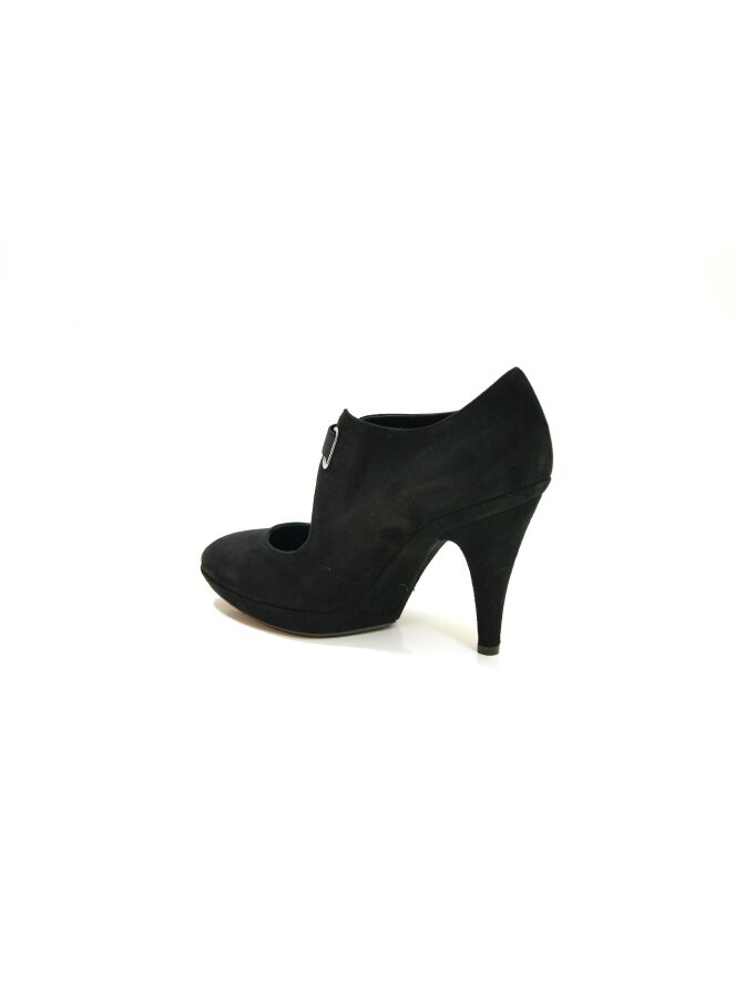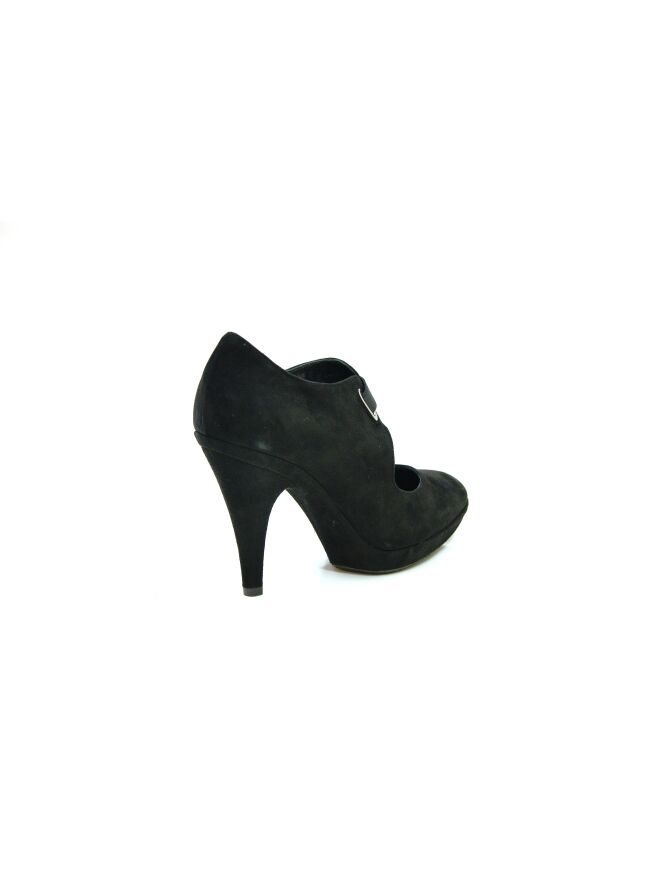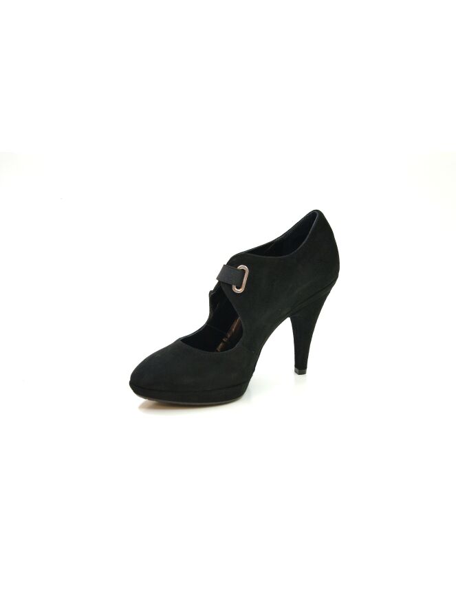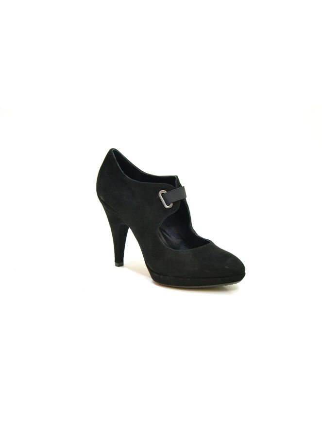 A Cristian Daniel pump in the color black. The pium has a large cut above the toe that meets on the instep with an elastic band with 2 decorative silver colored buckles. The inside is lined with leather.