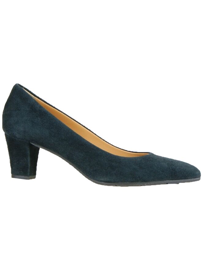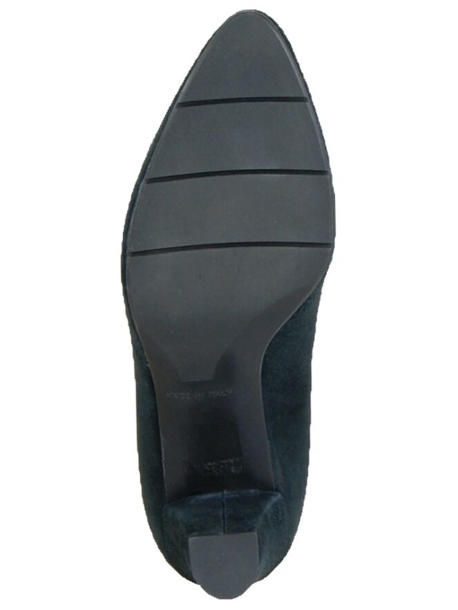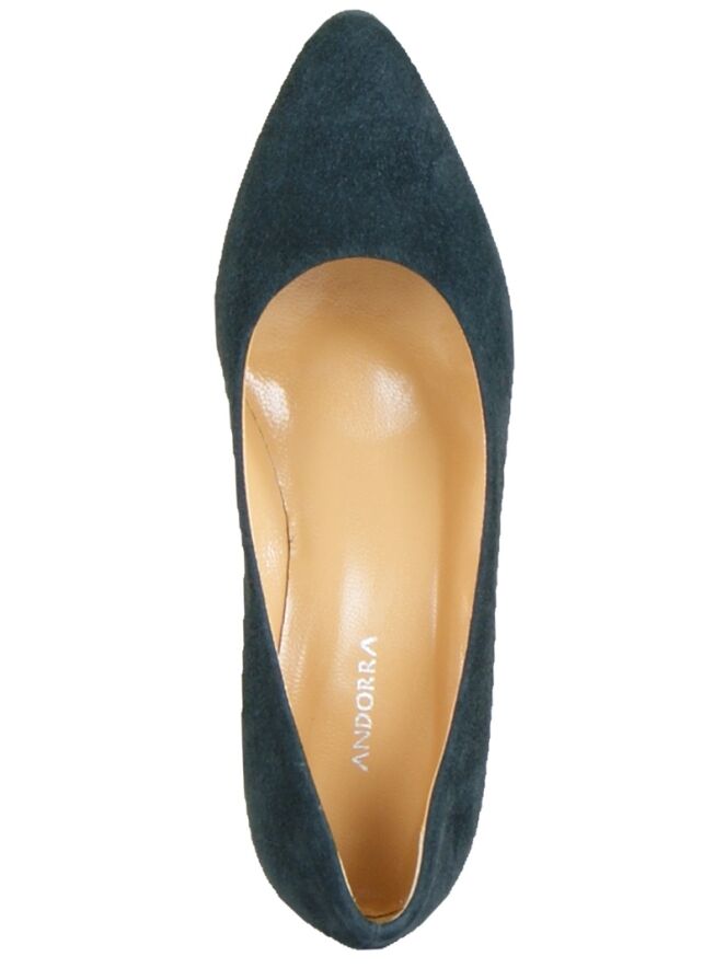A pump of the brand Cristian Daniel in the color navy bleu. The pump has a pointed round toe and the heel is covered in the same material as the shoe. This pump is on the inside with leather lined.