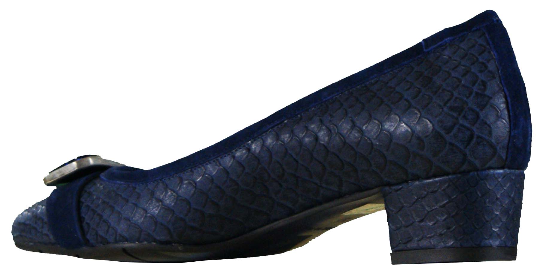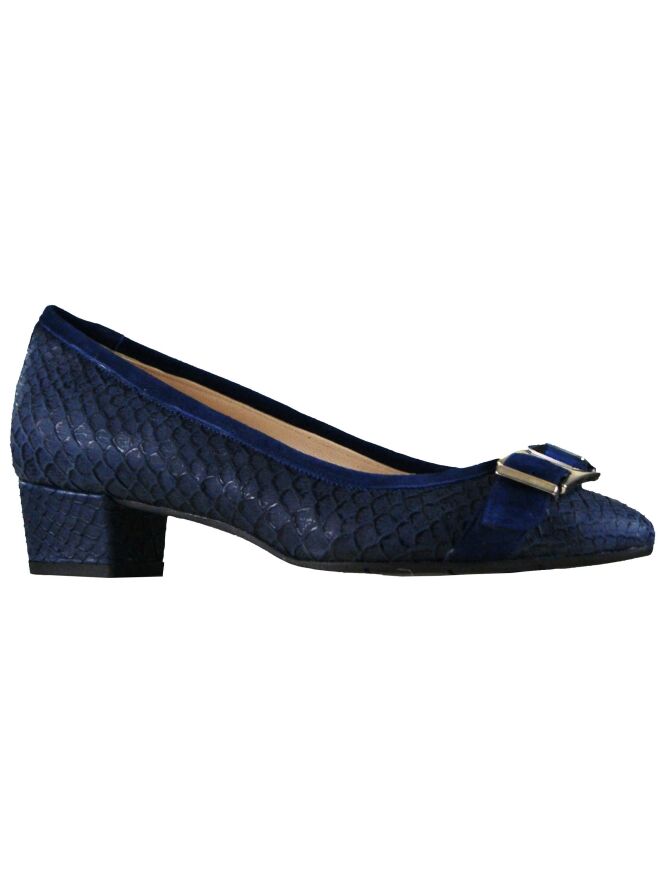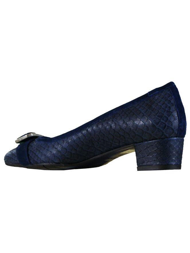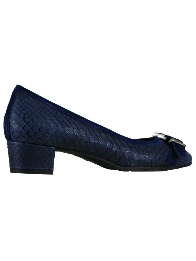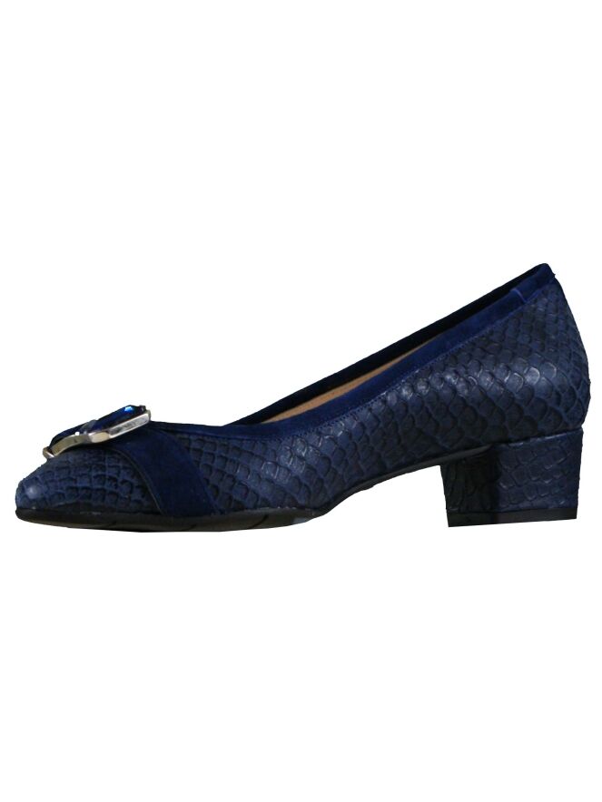 A pump of the brand Cristian Daniel in a reptile structure in the color bleu. On the forefoot is a broad band of suede with a buckle which has a bleu coloured stone. The inside of the pump is lined with leather.