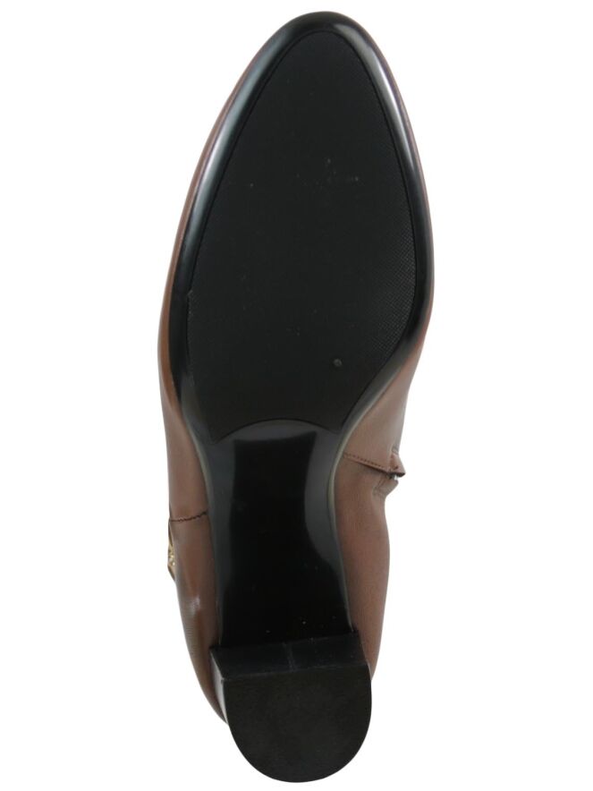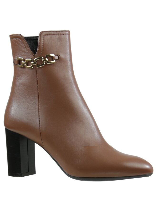 An ankleboot of the brand Cristian Daniel in the color brown. The boot has a round toe. On the outside is a gold-coloured link chain. The edge of the shaft has a little notch. The height is 15 cm from the heel and shaft size is 25 cm. block heel and The ankle boot has a neutral black is on the inside with leather lined.