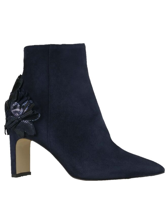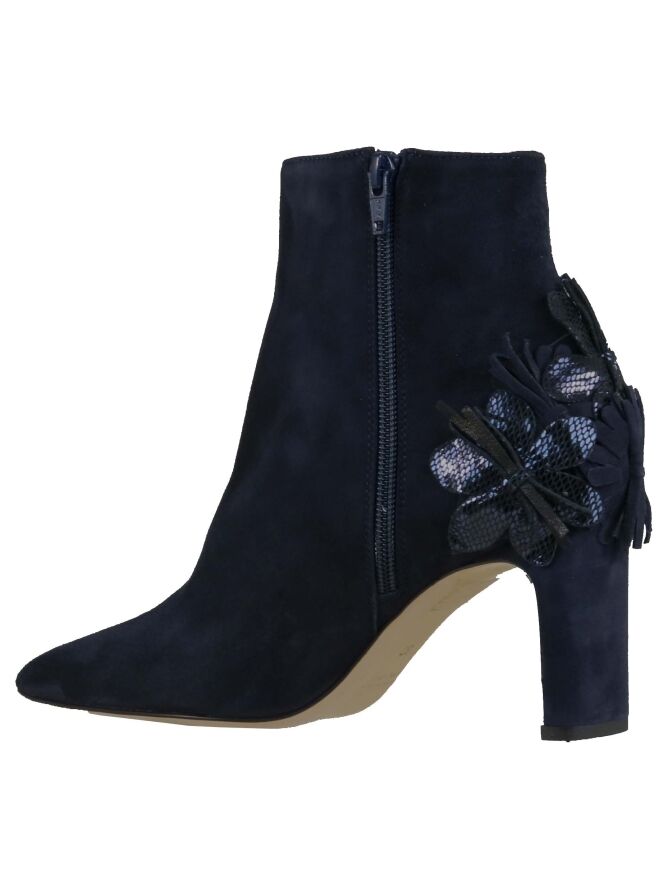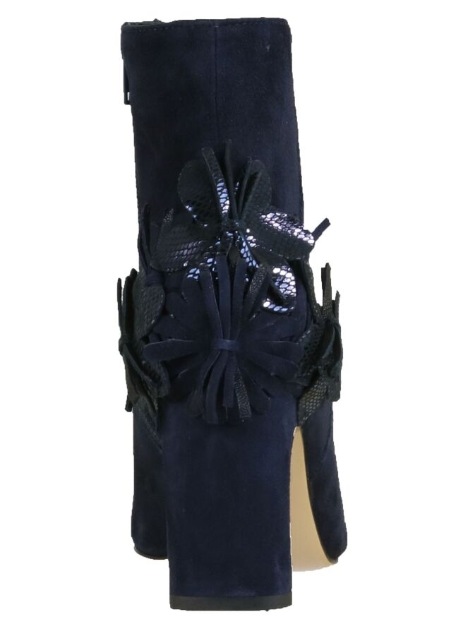 A single boot of the brand Cristian Daniel in the color midnight blue. The boot has a pointed toe and has on the heel a decoration of flowers with fringes in leather with a waffle print. The elegant heel is lined in suede. The inside is lined with leather.