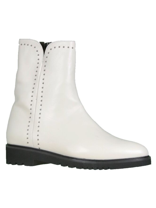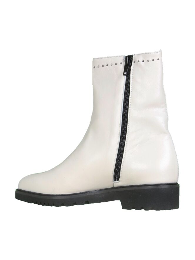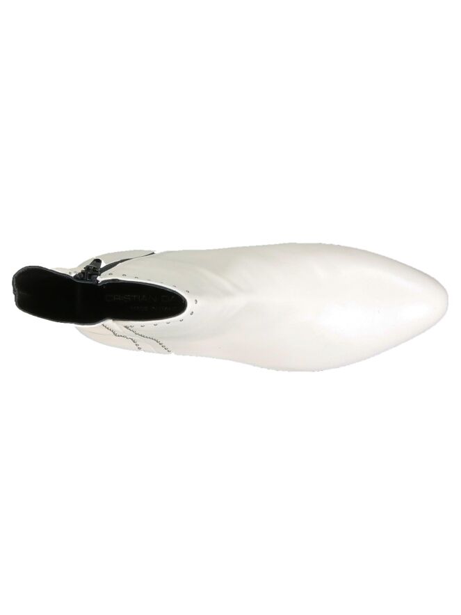 An ankle boot from Cristian Daniel in the color creamy white. Along the outside of the shaft and the top edge are small silver colored studs. On the inside is a zipper. The shaft is lined with leather.