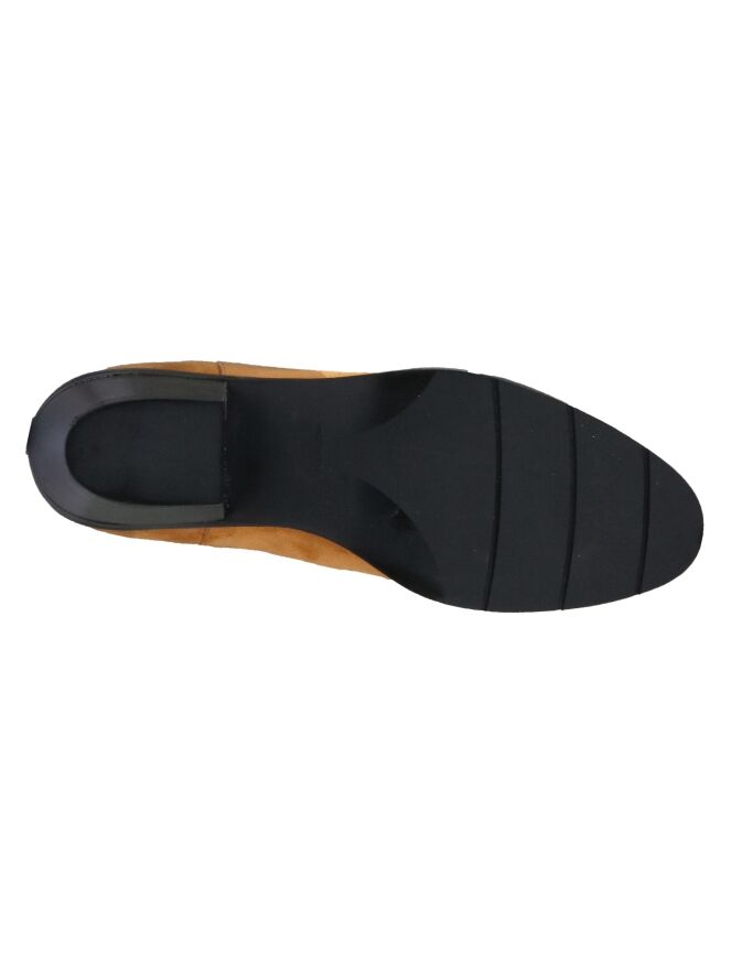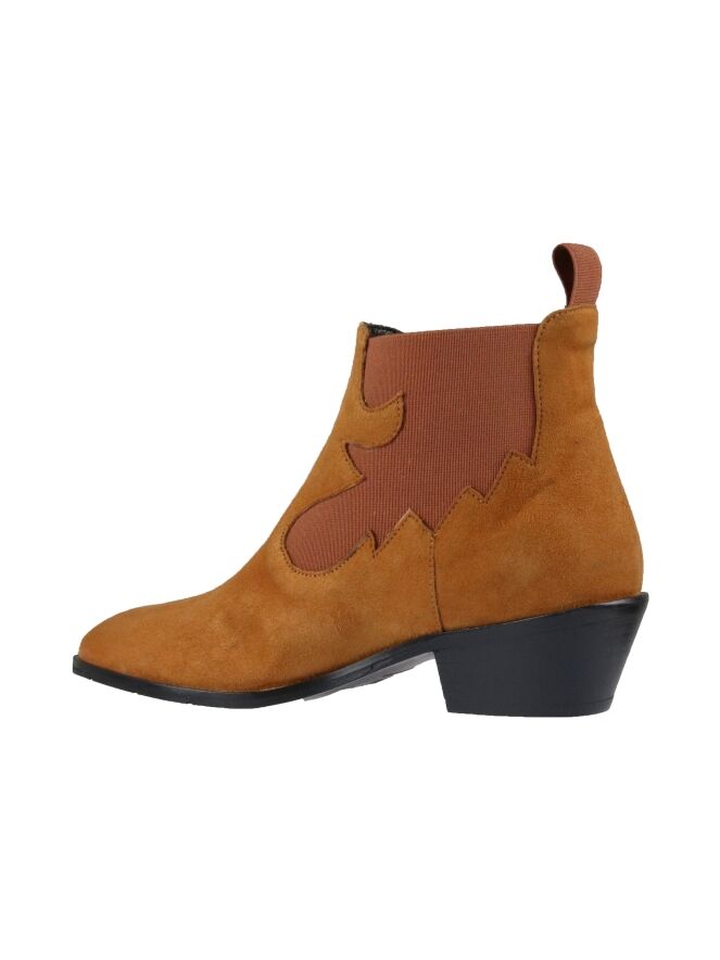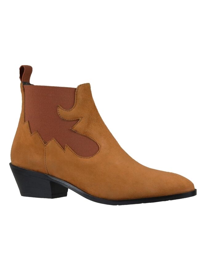 A western boot by Cristian Daniel in the color cognac. Both sides have an elastic fabric in the color brown cut in a western look. The toe is round and the heel is black. The inside is lined with leather.