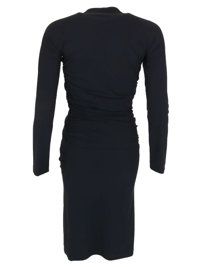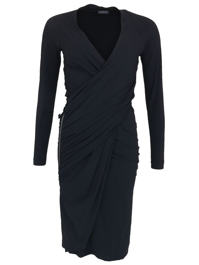 A wrap dress from Cassiopée in the color black. From the waist a diagonal zipper with pleated fabric is created from the left side which gives a draping effect. This dress can be washed at 30 degrees.