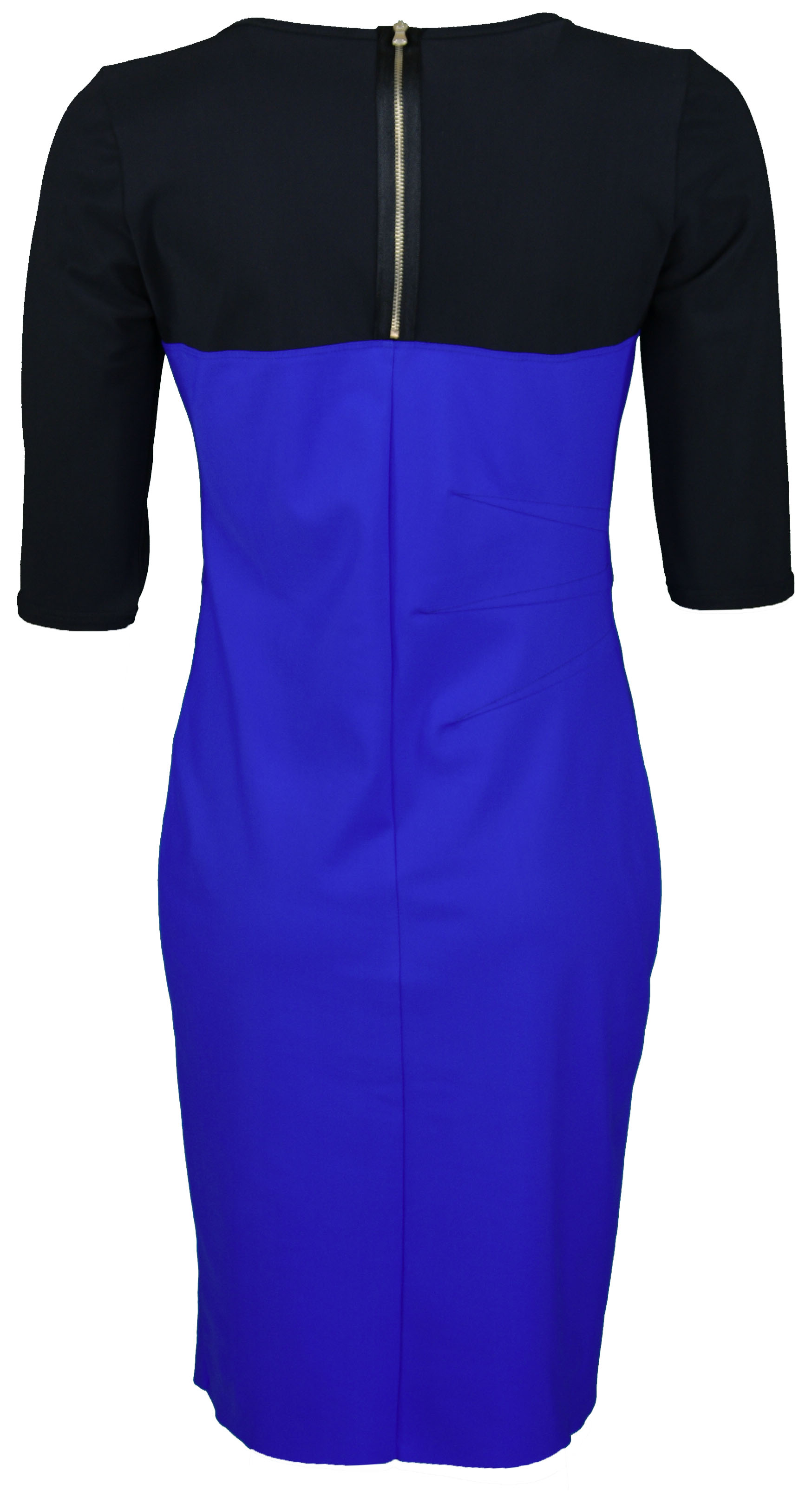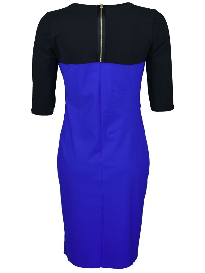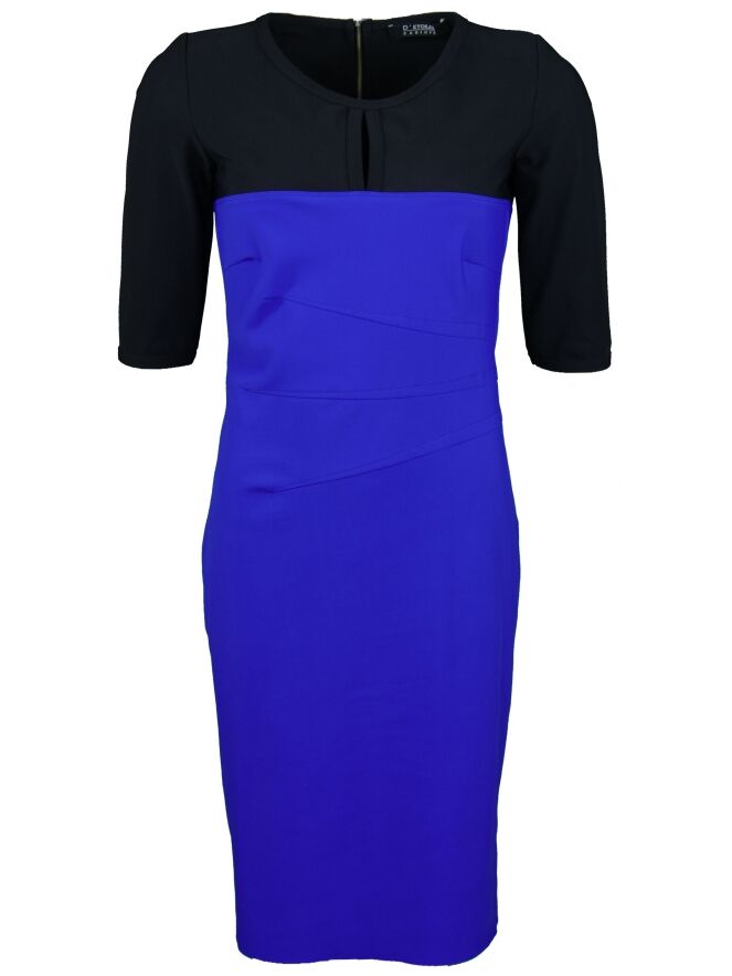 A dress from the brand d\'Etoiles Casiopé in the colors black with cobalt blue. The dress is slightly fitted with with from the right side 3 pleated seams at the waist. The dress has half sleeves and a round neckline. this dress may be washed at 30 degrees.
