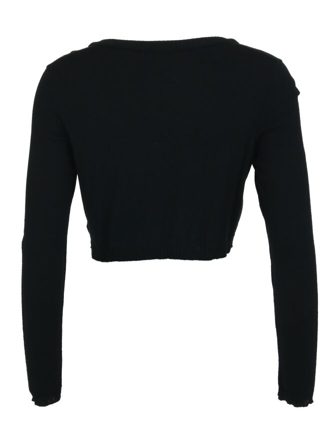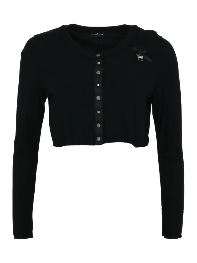 A bolero vest by Cassiopée in the color black. The cardigan has a round neck and the buttons of the closure are in round and square bronze studs. This vest can be washed at 30 degrees.