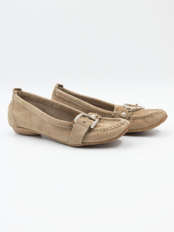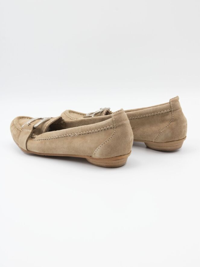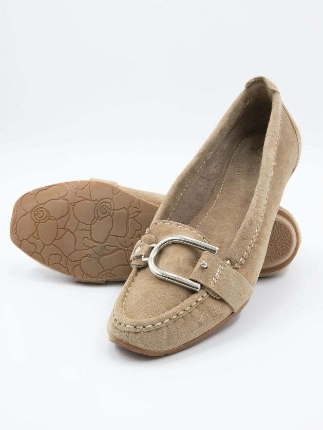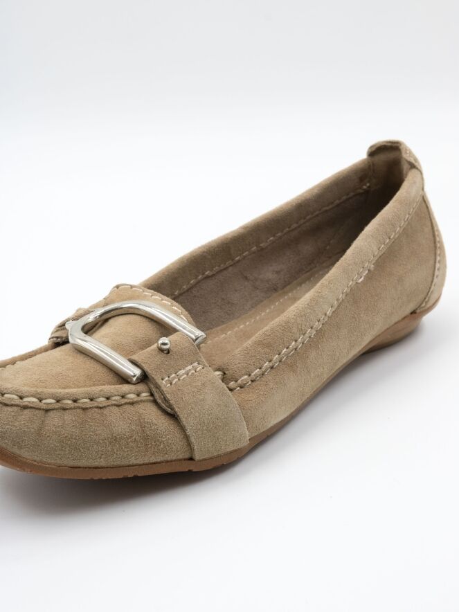 A moccasin from DMN in sand color. Across the forefoot, there is a strap with a silver-colored buckle. The interior is unlined.