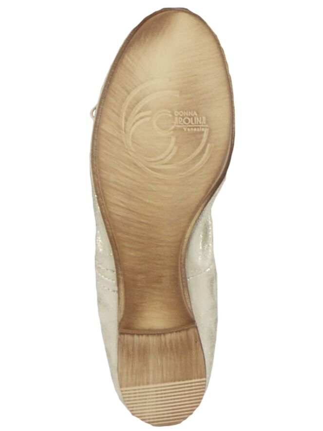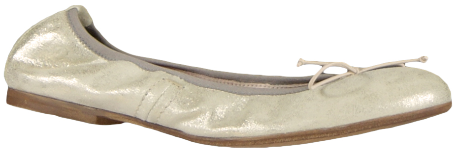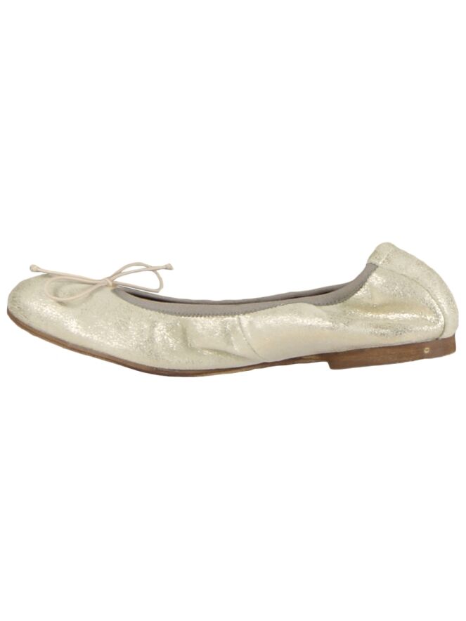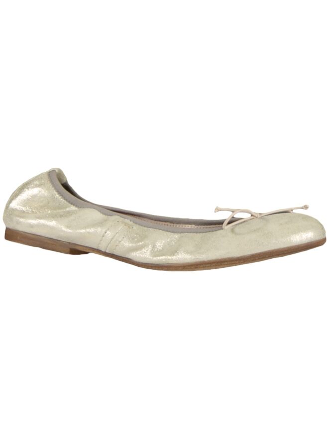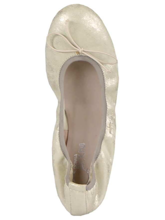 A beautiful ballerina from the Donna Carolina brand in a platinum color. The color has a wrinkled effect and is slightly brossed on the toe. The ballerina has a fabric trim and the inner lining is leather. The small bow on the front is a nice detail.