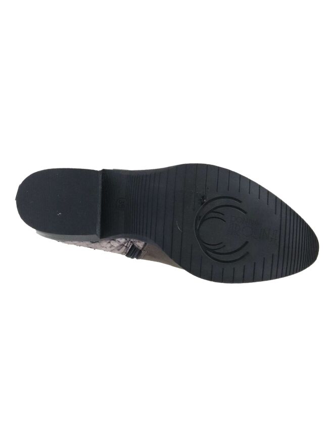 An Donna Carolina ankle boot in the taupe. The front part of the boot is in smooth nappa leather. The rear part is in a reptile print. On the outside, a piping of mocha-colored nappa leather is made on the seam of the transition of the materials. The boot has a leather lining.