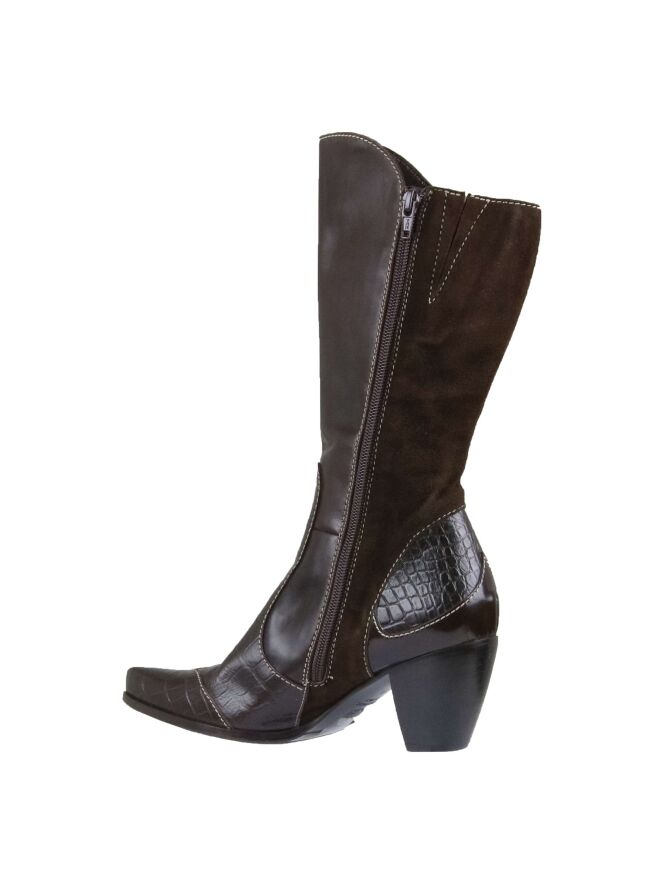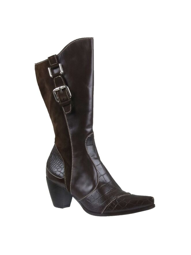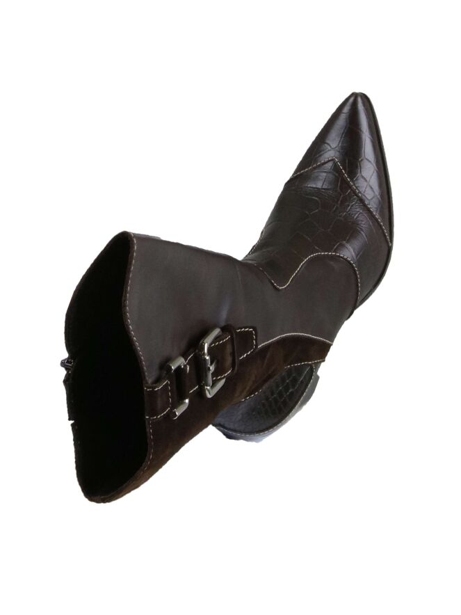 A mid-height western boot from Dyva in the color mocha brown. The shaft is on the front is a nappa leather and on the back in a camoscio suede. At the top of the shaft is a vertical decorative belt with a silver colored buckle. The heel and forefoot with a pointed toe is in a croco leather. On the inside of the shaft is an elastic band. The inside is lined with leather.