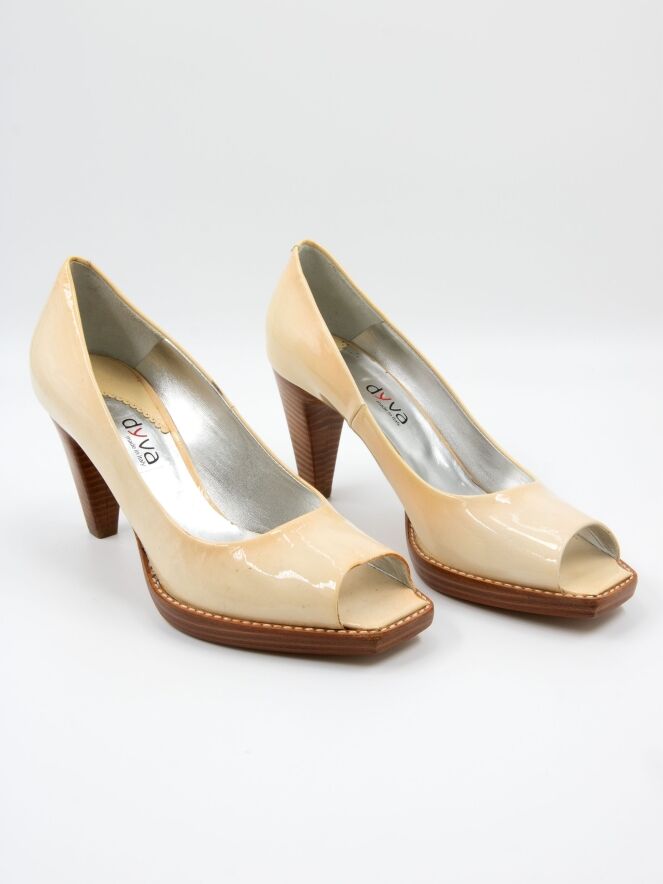 An open-toe pump from Dyva in a marbled ivory shade with a peach twist along the edges. The pump features a wood-colored platform sole with a woven trim.