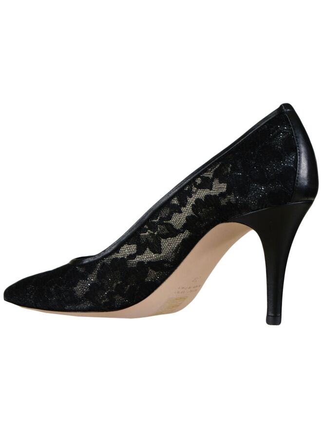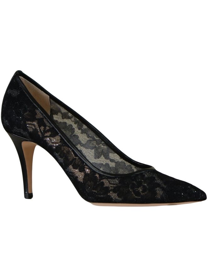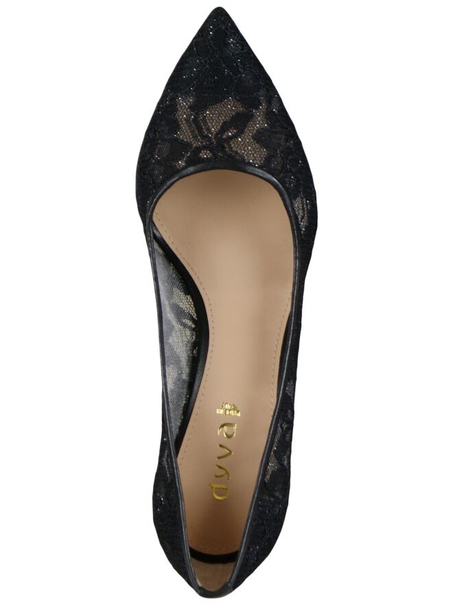 A pump of the brand Dyva in a lace fabric with a silver thread woven through it in the color black. The toe of the pump is pointed. The inside of the pump is lined with leather.