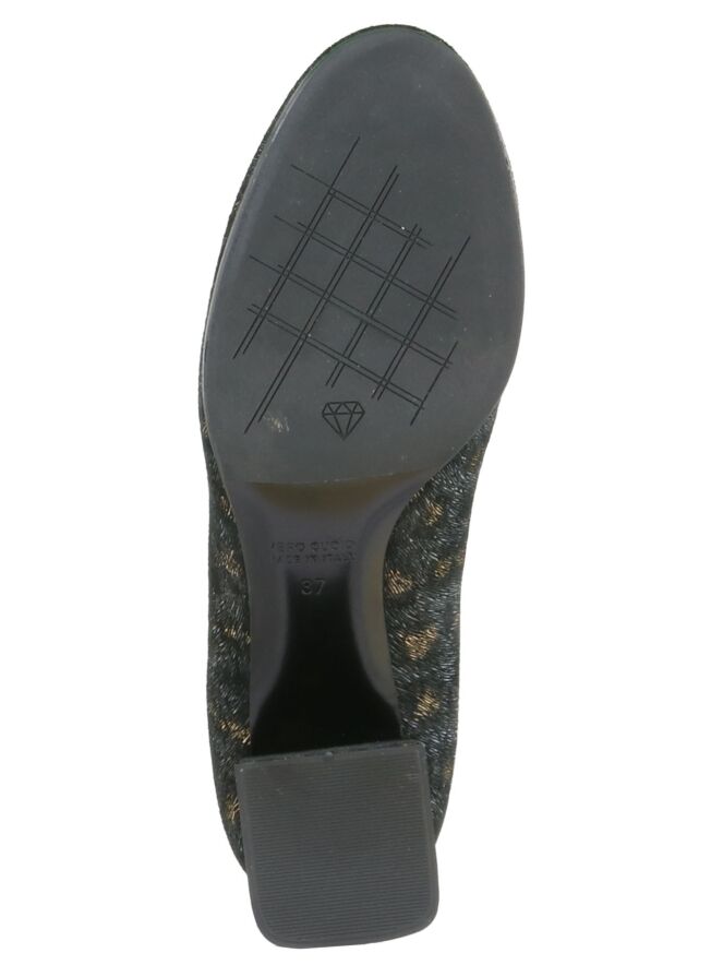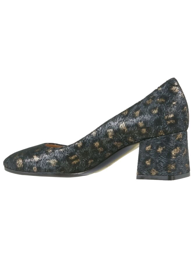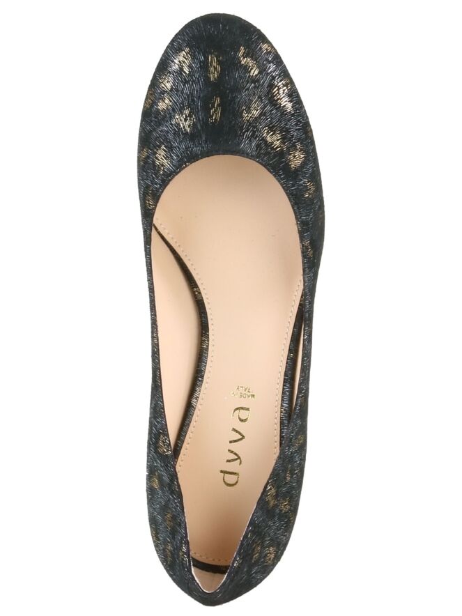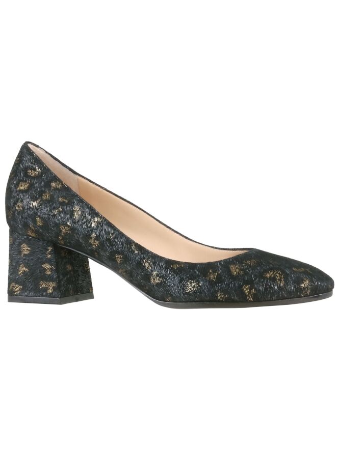 A pump of the brand Dyva in a print with the colors Navy Blue, black and gold. The pump has a round toe and a heel which is covered with the same material as the pump. The inside of the pump is lined with leather.