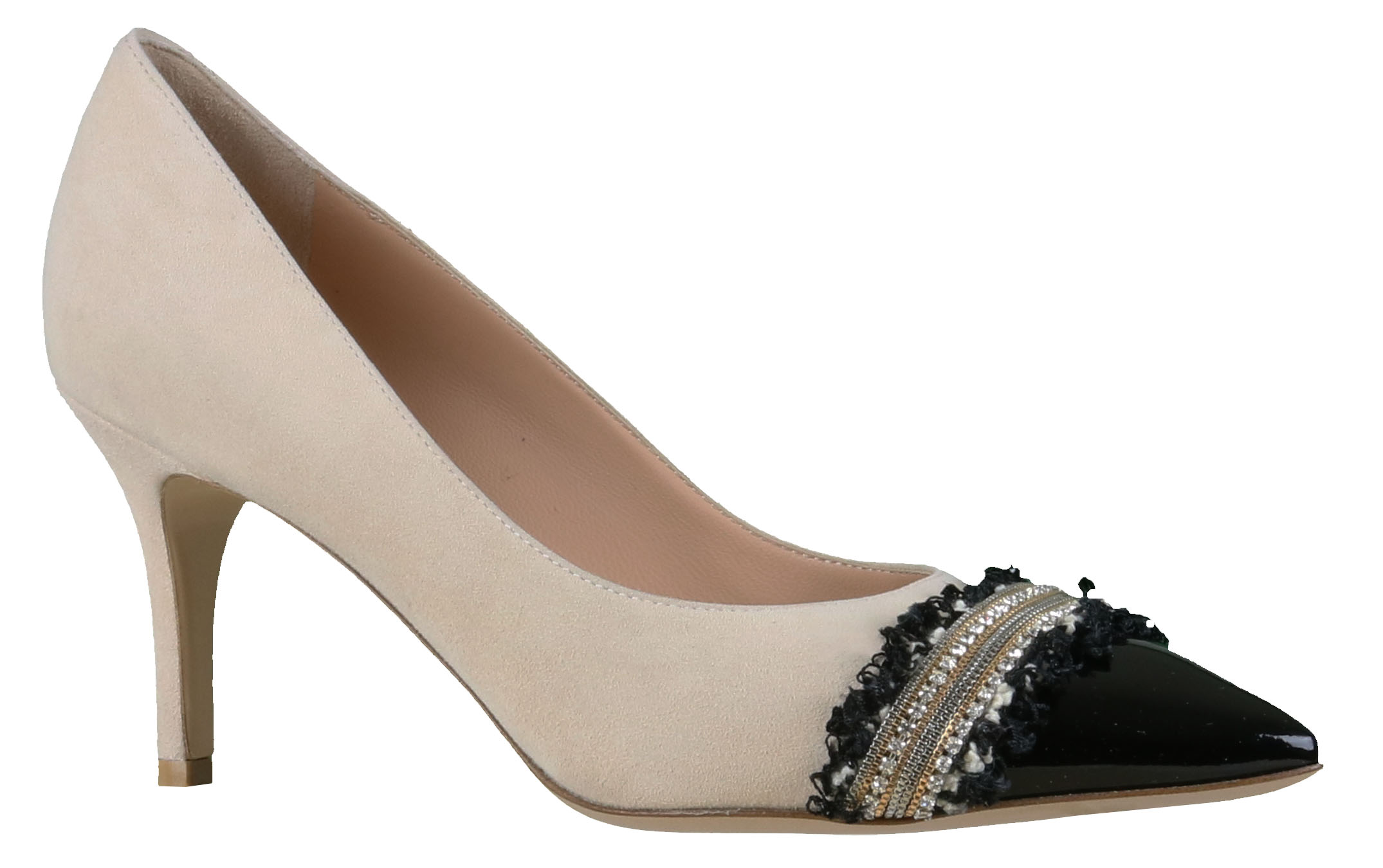a Dyva pump in a nude color. The pointed toe is in patent leather. On the forefoot is a silver and gold colored decorative trim with rhinestones and short black and creamy white satin fringes. The Elegant heel is in the same material as the pump. The inside is lined with leather. This pump matches the dyva bag with article number: 404000179