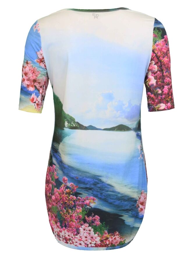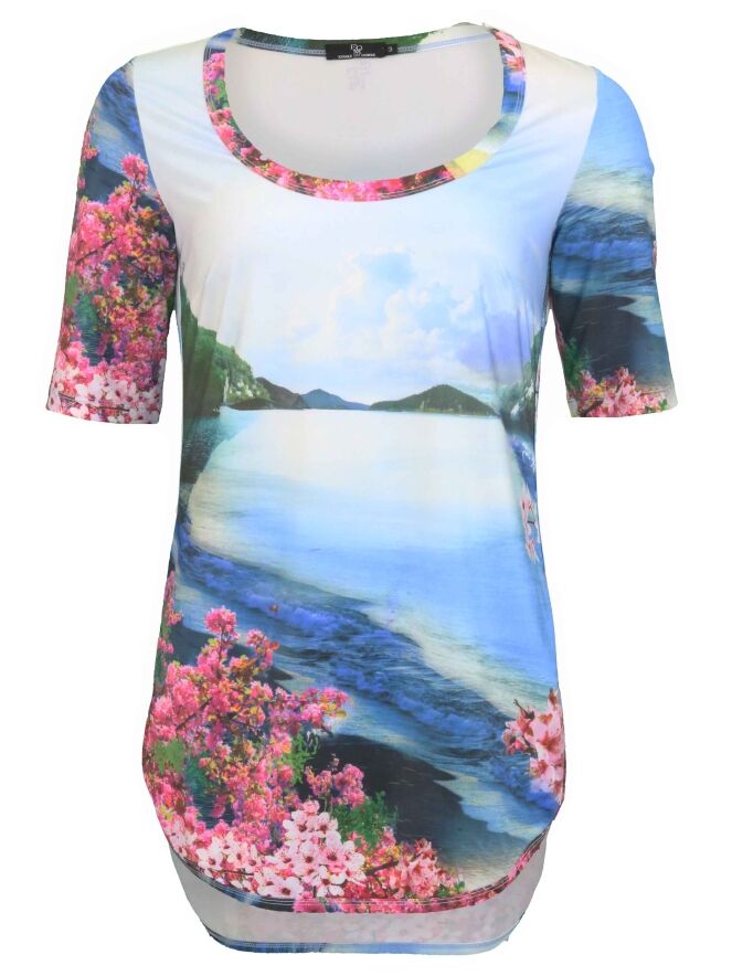 A long shirt or tunique of the brand Etoile du Monde in a landscape print with the colours bleu, green and fuchsia. The band of the round neckline is in the same print. The back of the shirt is 5 cm longer as the front. This shirt can be washed at 30 degrees.