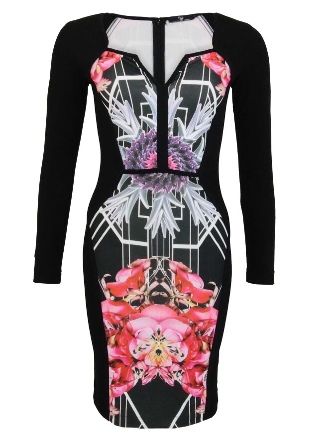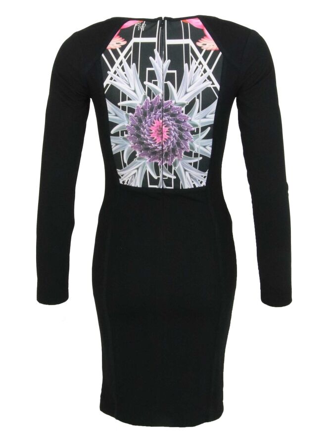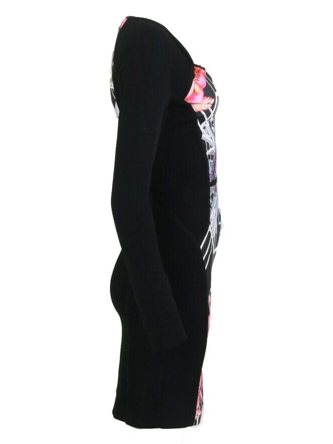 A dress from Etoile du monde in a pink floral print on a black background. The tasille is accentuated by a narrow horizontal band. The back of the dress is in solid black. This dress can be washed cold by hand.